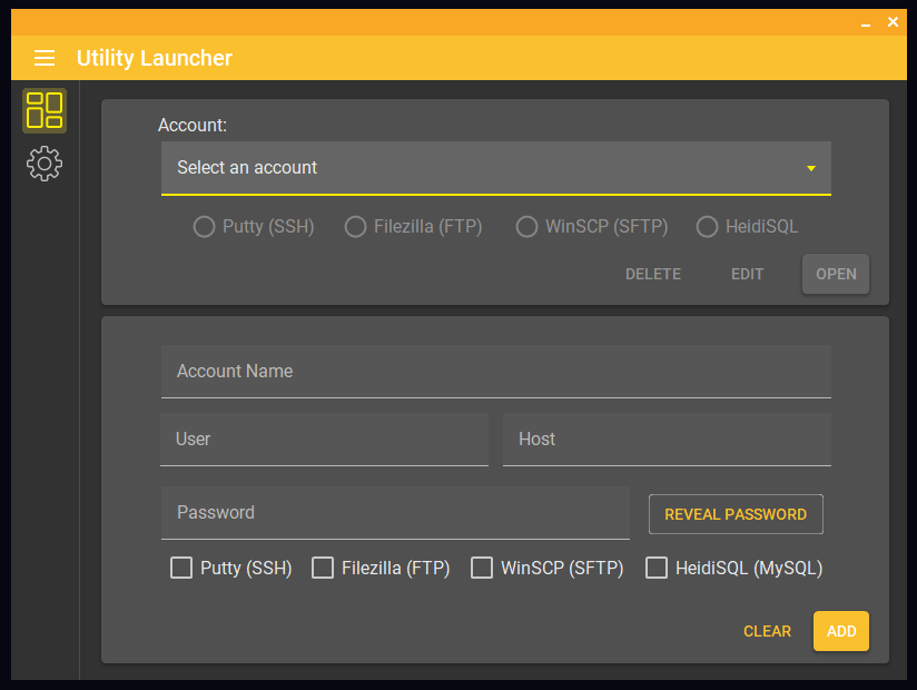 Utility Launcher is a C# application designed to manage and launch various applications and connections through a graphical interface. The program allows users to store and access accounts for different services and applications, including PuTTY, FileZilla, WinSCP, and HeidiSQL.