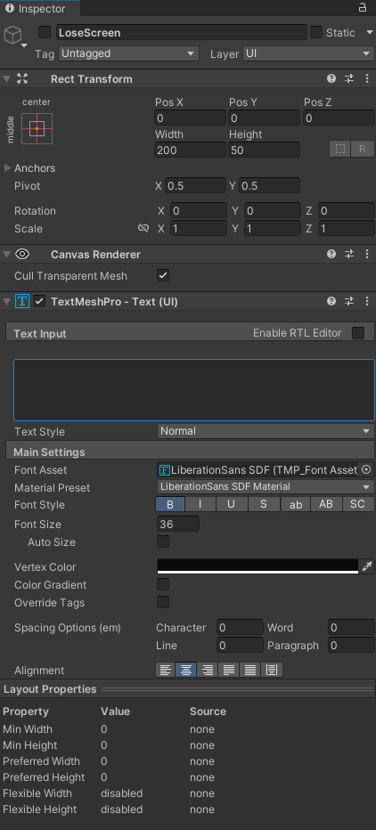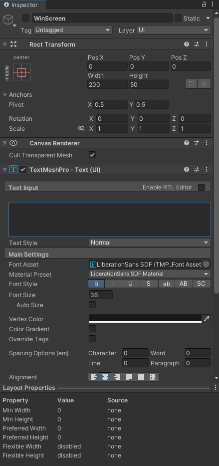 - Настройка компонентов WinScreen и LoseScreen (дочерние объекты Canvas)