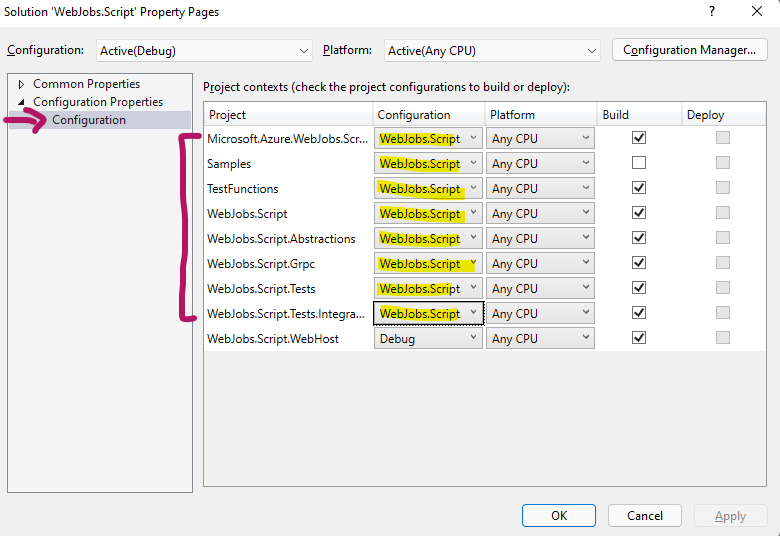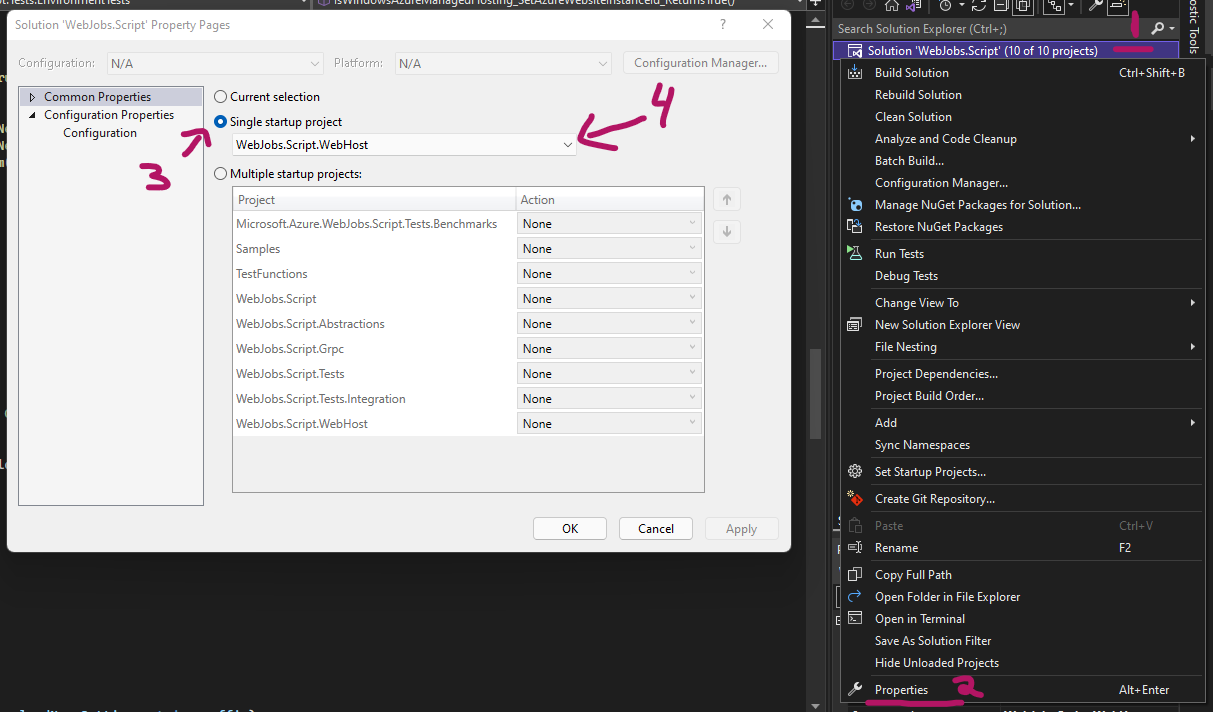 - Set every project EXCEPT the WebJobs.Script.WebHost Configuration to "WebJobs.Script.WebHost.Core"