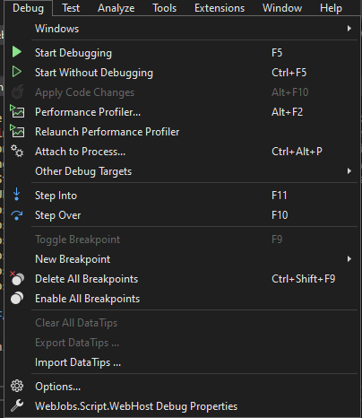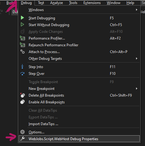 - Click Debug from the top menu and select WebJobs.Script.WebHost Debug Properties