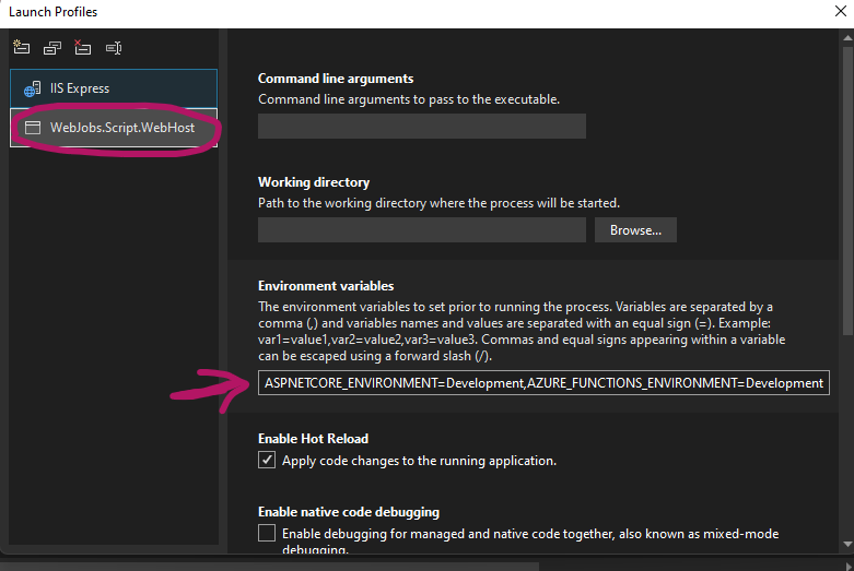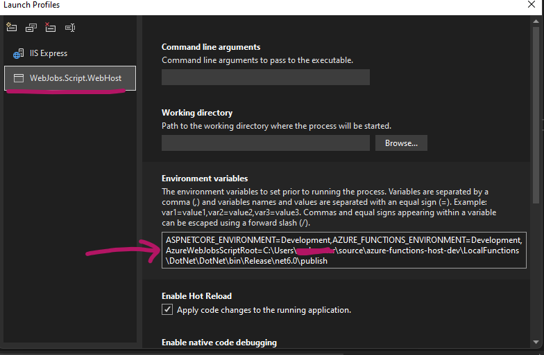 Now select the WebJobs.Script.WebHost and we are going to add a new Environment variable to the list.