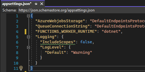 Now we will add in the AzureWebJobsStorage and QueueConnectionString to the appsettings.json