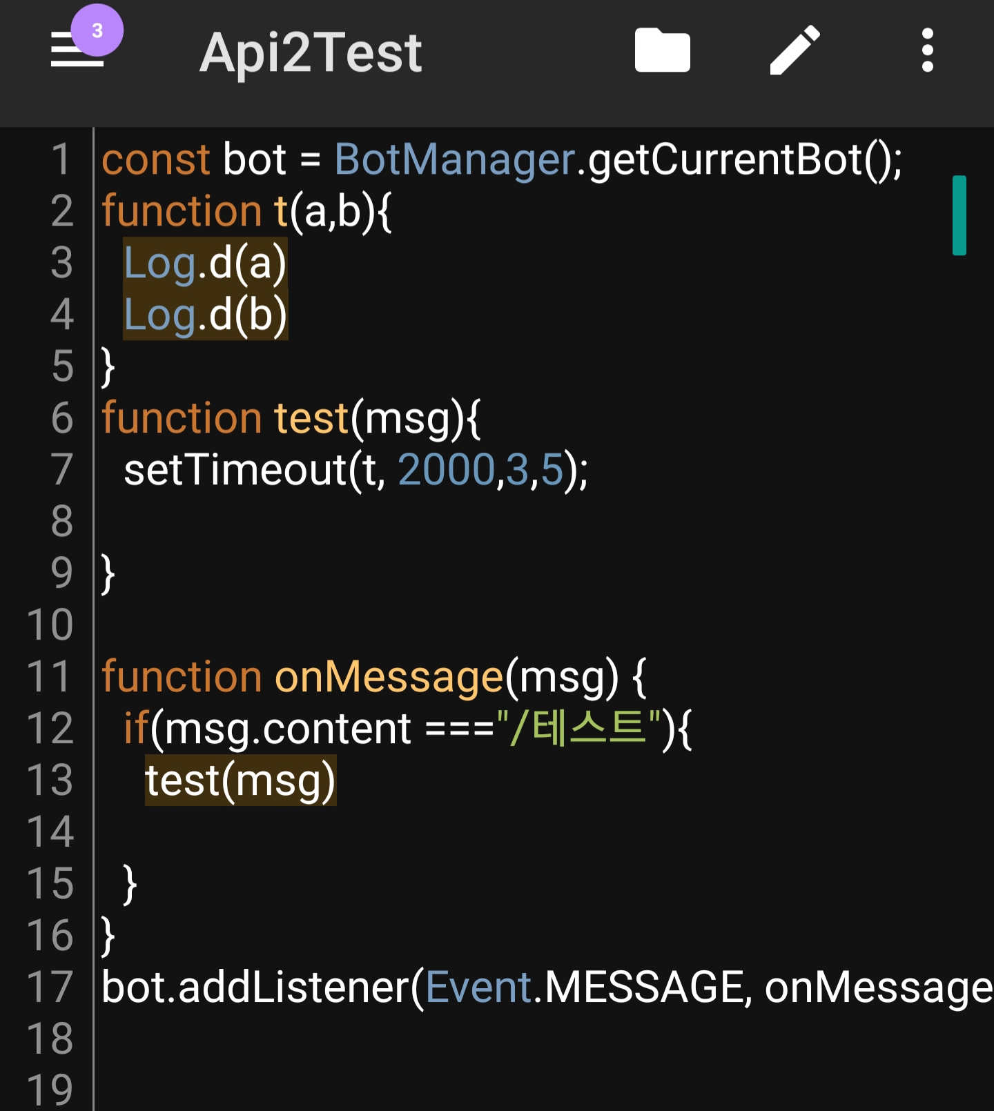 표준 구현메봇 구현setTimeout(func, delay,arg1....)인데 메봇에서는 setTimeout(func, delay, [arg1,...]) 이리 구현 되어있습니다