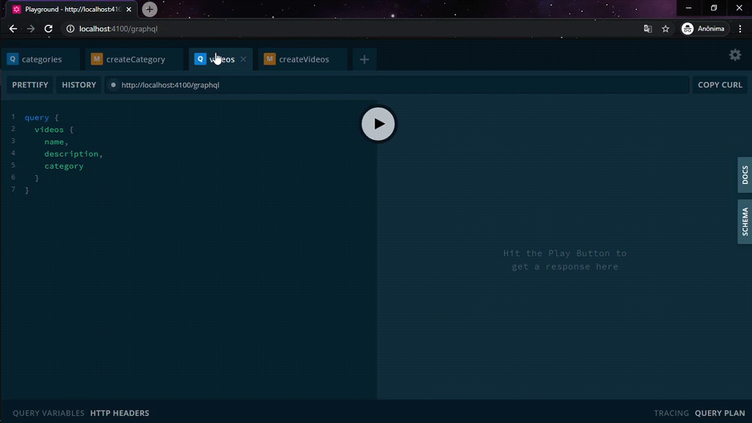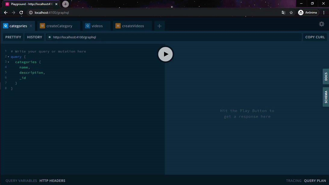 $ yarn devQuando o projeto estiver iniciado, abrimos o browser e acessamos o endereço http://localhost:4100/graphql ou clique aqui