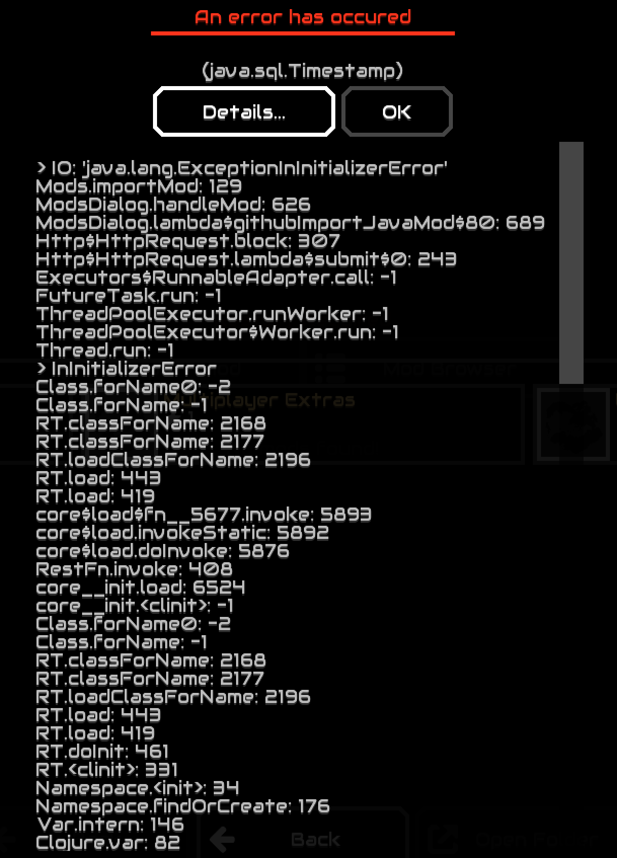 Hi weathercold! I get this when I try to install your mod today: An error has occurred (java.sql.Timestamp) Thanks! My system is MacOS 12.6.5 Mindustry 143.1 I have openjdk 11.0.9.1 2020-11-04 installed <img width="609" alt="Screen Shot 2023-04-30 at 8 39 58 PM" src="https://user-images.githubusercontent.com/202651/235384219-5b382e47-2e34-4dbd-8208-6e88dc3d9cd4.png"> <img width="609" alt="Screen Shot 2023-04-30 at 8 40 11 PM" src="https://user-images.githubusercontent.com/202651/235384230-79038809-7088-45ba-be71-e9d669633625.png"> <img width="605" alt="Screen Shot 2023-04-30 at 8 40 22 PM" src="https://user-images.githubusercontent.com/202651/235384233-dc150d1b-06f2-4940-92de-f320fe47a113.png">