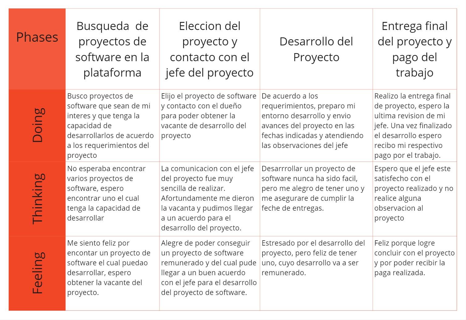 | Conoce al menos un sector empresarial o dominio de aplicación de soluciones de software. | Zaid Ramirez: TB1: Durante la elaboración del proyecto, pude identificar problemáticas y aplicar un proceso de UX Design basado en Lean UX. Realizando investigación de UX Research para establecer User Personas, Task Matrix y Journey Maps, integrándolos en el diseño del Landing Page y las Web Apps. Ademas de utilizar las User Stories y principios de diseño para crear propuestas visuales coherentes con nuestros style guideline. TP1: Para la entrega utilizamos vue para elaborar la app, me encargue de la logica del login con la api y la pagina principal para la vista de empresas con su consumo a la api André Arroyo TB1: En nuestro proyecto, utilizamos métodos avanzados de especificación de requisitos para garantizar que el software se ajustara a las necesidades de los usuarios. Empleamos técnicas como el Mapeo del Escenario Futuro, Historias de Usuario y Mapeo de Impacto para definir y priorizar requerimientos esenciales. Asimismo, elaboramos un Product Backlog detallado y configuramos un entorno de desarrollo óptimo, reforzado con convenciones de código rigurosas, para asegurar la calidad y eficacia del software final, cumpliendo con las expectativas y regulaciones del sector. **TP1:**En esta entrega realice la pantalla de postulacion de proyecto de los freelancers, asimismo desarrolle el toolbar para los empresarios y freelancers, asi como el respectivo footer. Por ultimo apoye en la realizacion de la documentacion del sprint 2. Samira Alvarez: TB1: En este avance del trabajo se pudo determinar el estado actual del mercado de plataformas de contratación freelance e identificar las fortalezas y debilidades frente a nuestros competidores, así como las estrategias para destacarnos frente a ellos. De igual forma, se analizó el comportamiento, necesidades y preferencias de los segmentos desarrollador freelance y empresario mediante las entrevistas realizadas. Dicha información fue clave para desarrollar el needfinding de nuestros clientes, donde se usó distintas herramientas de mapeo y la creación de user personas de la aplicación web. TP: Durante este avance del trabajo, hemos desarrollado los componentes que conforman el frontend de nuestra aplicación web, los cuales permiten a los usuarios ingresar a la aplicación, así como observar la cantidad de entregables por proyecto o agregar y editar su información. Joseph Llacchua : TB1: He tenido la oportunidad de trabajar en el sector empresarial de soluciones de software, donde he destacado en áreas como el diseño de experiencia de usuario (UX) y la especificación de requisitos. Durante mi participación en el proyecto, pude identificar problemáticas y aplicar un proceso de UX Design basado en Lean UX. Realicé investigaciones de UX Research para establecer User Personas, Task Matrix y Journey Maps, integrándolos en el diseño del Landing Page y las Web Apps. Además, utilicé las User Stories y principios de diseño para crear propuestas visuales coherentes con nuestros style guidelines. TP: Tuve la oportunidad de trabajar en el campo de la investigación y diseño de productos tecnológicos. Durante mi participación en el proyecto, me enfoqué en la fase inicial de investigación, realizando entrevistas y análisis de las mismas para comprender las necesidades y deseos de los usuarios. Además, contribuí al desarrollo de la página de inicio (landing page), asegurándome de que fuera responsive para adaptarse a diferentes dispositivos. También realicé correcciones de componentes para mejorar la usabilidad y la experiencia del usuario. Mi trabajo ayudó a establecer una base sólida para el desarrollo de soluciones centradas en el usuario. Jair Velasquez : TB1: En el sector empresarial de soluciones de software, he participado en el diseño de experiencia de usuario (UX) y la especificación de requisitos, concentrándome en la creación de diagramas de clases y modelado de C4 con herramientas como Lucidchart. Además, he contribuido en la creación de prototipos para el landing page y la aplicación web utilizando Figma, integrando estos elementos en propuestas visuales coherentes con nuestros lineamientos de estilo. **TP1:**En esta entrega realice la pantalla de buscar desarrollador, tambien la revision de entregables, agregado a esto trabaje en la logica de ingresar al perfil de un desarrollador. |