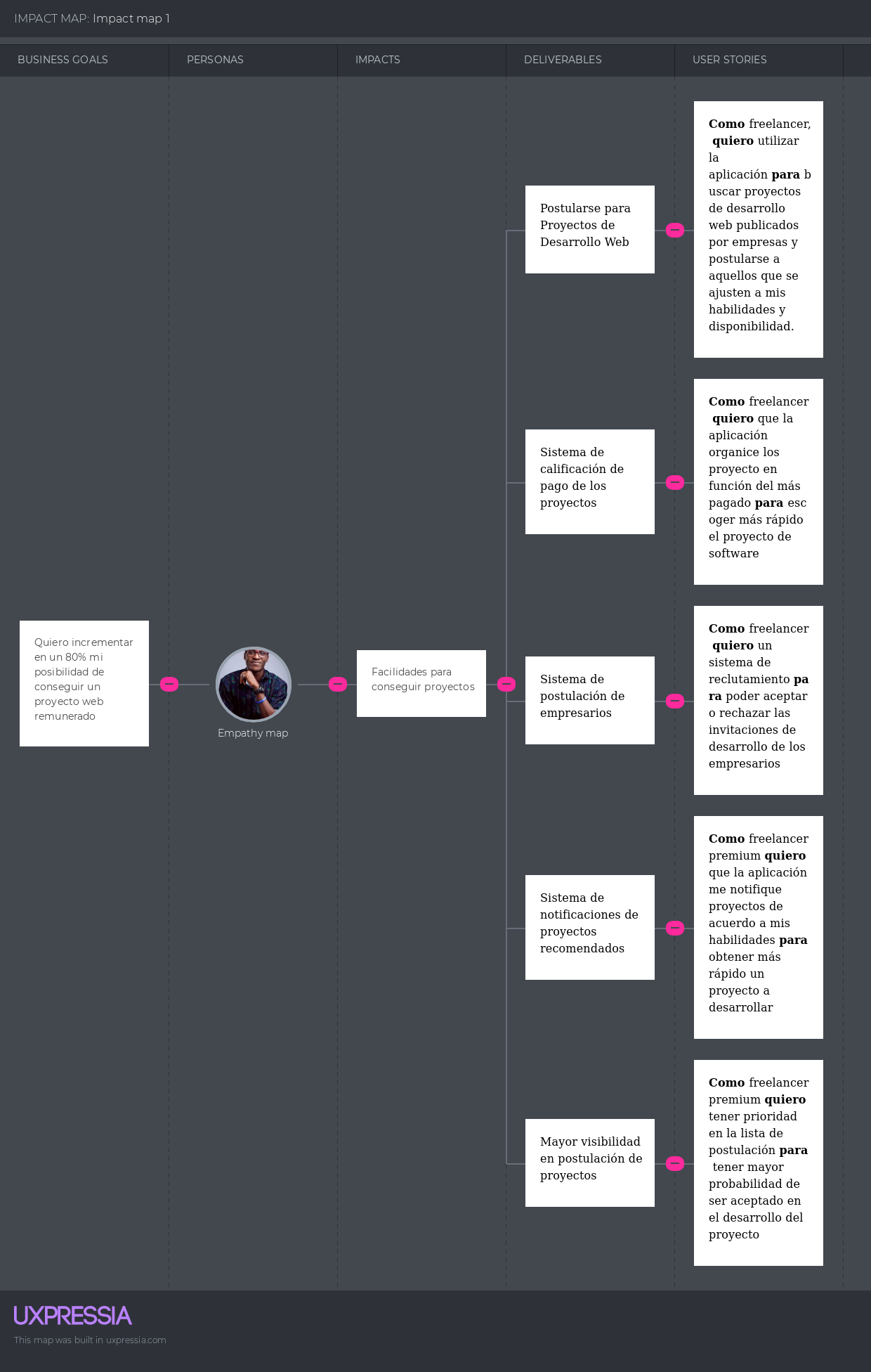 Mercado objetivo | PYMEs y emprendimientos que buscan subcontratar a un desarrollador para trabajar en una solución de software y freelancers en busca de una oportunidad de trabajo. | Pequeñas, medianas y grandes empresas que quieran contratar a freelancers para desarrollar sus proyectos. Trabajadores independientes que buscan una oportunidad de trabajo. | Empresas de todos los tamaños que buscan contratar trabajadores independientes para desarrollar proyectos de distintas áreas. Freelancers en busca de una oportunidad de trabajo. | PYMEs y emprendimientos que requieran una solución de software. Desarrolladores en busca de un mentor o una oportunidad de trabajo. | |
