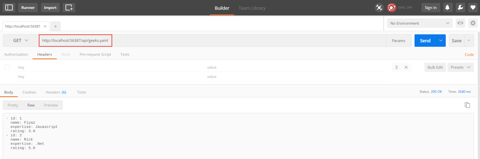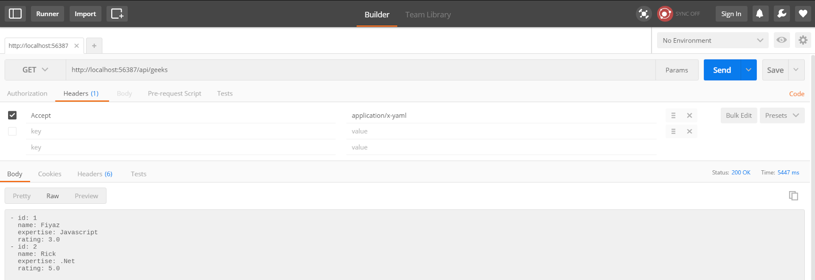 If you don’t want to use those headers while calling your controller’s actions you can explicitly define the type of formatter that should be used while getting or posting content. For example, the [Produces(application/x-yaml)] will return the response in Yaml format whether you define a Accept header or not. Again using the [Consumes(application/x-yaml)] attribute would only accept Yaml content whether you define the Content-Type or not.