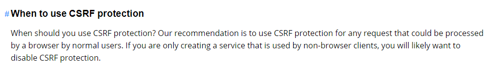 그래서 이렇게 보안 수준을 향상시키는 CSRF를 왜 disable 하였을까? spring security documentation에 non-browser clients 만을 위한 서비스라면 csrf를 disable 하여도 좋다고 한다.