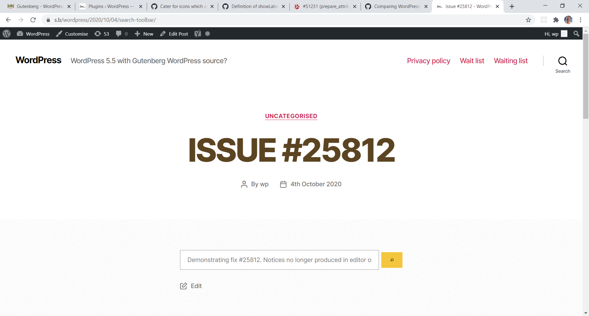 In a local development environment. After applying the change I edited and viewed the Search block I'd created earlier. The Notices were no longer displayed.