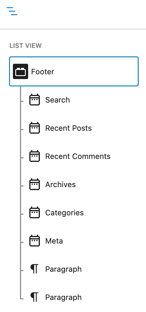 Menu item in the top toolbar to select blocks from a list of links.