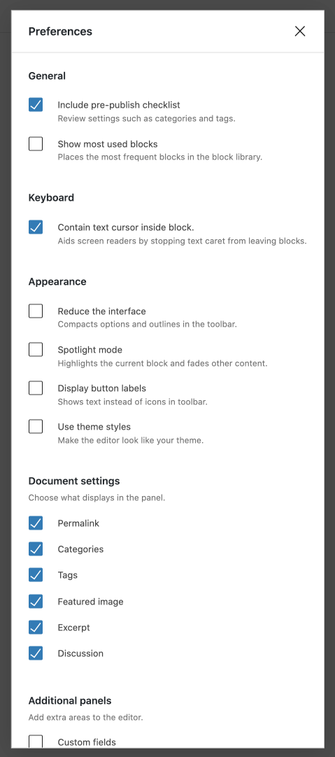 This responds to feedback on #25837 and iterates the grouping of the changes to the preferences panel. There have been quite a few changes for this release, but the grouping wasn't really modified. This small PR responds to the feedback by @mtias to adjust the grouping.