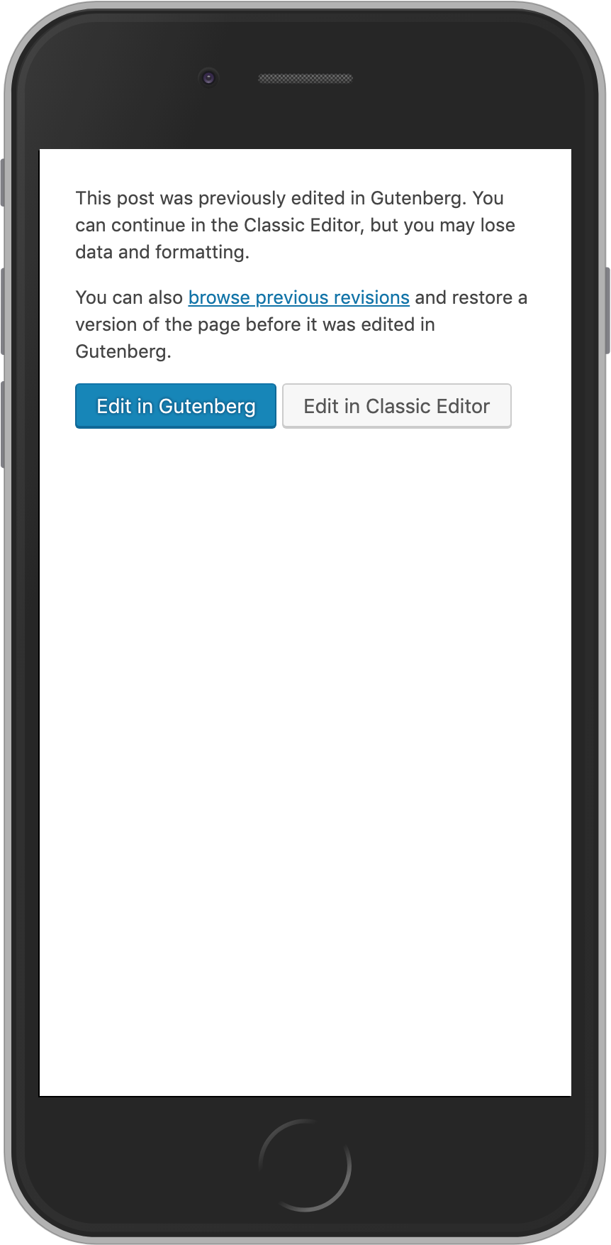(This one is slightly tricky because we don't necessarily know that a post was created in Classic and then converted to Gutenberg, but as this is the main context you'd want revisions, I think the message is still appropriate.) If Revisions are disabled: