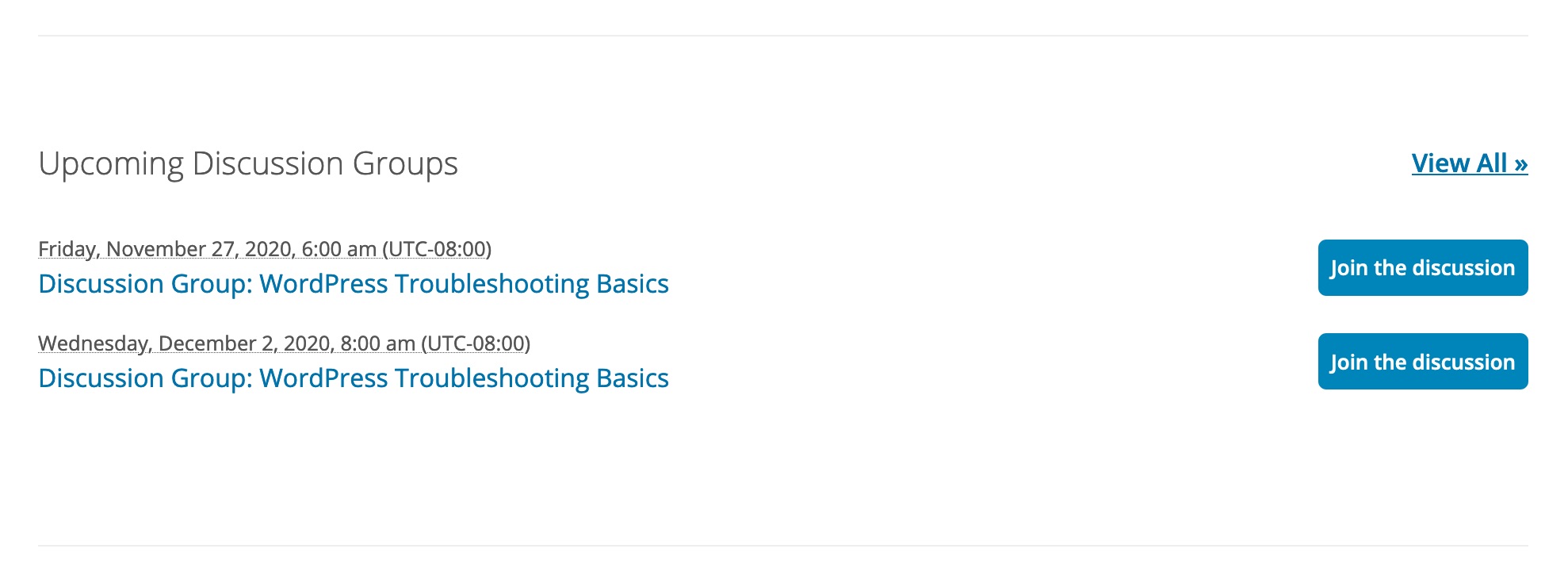 wporg_eventsdatabase table (same table used by the Official WordPress Events plugin, and the Events API). In this case it is only pulling meetup events from the one group that is being used to organize these discussion groups. Up to three events will be displayed in a new section on the Learn front page. The events' date and time are rendered in UTC, and then progressively updated via JavaScript to show the site visitor's presumed local timezone, based on the timezone setting of their browser.Fixes #143