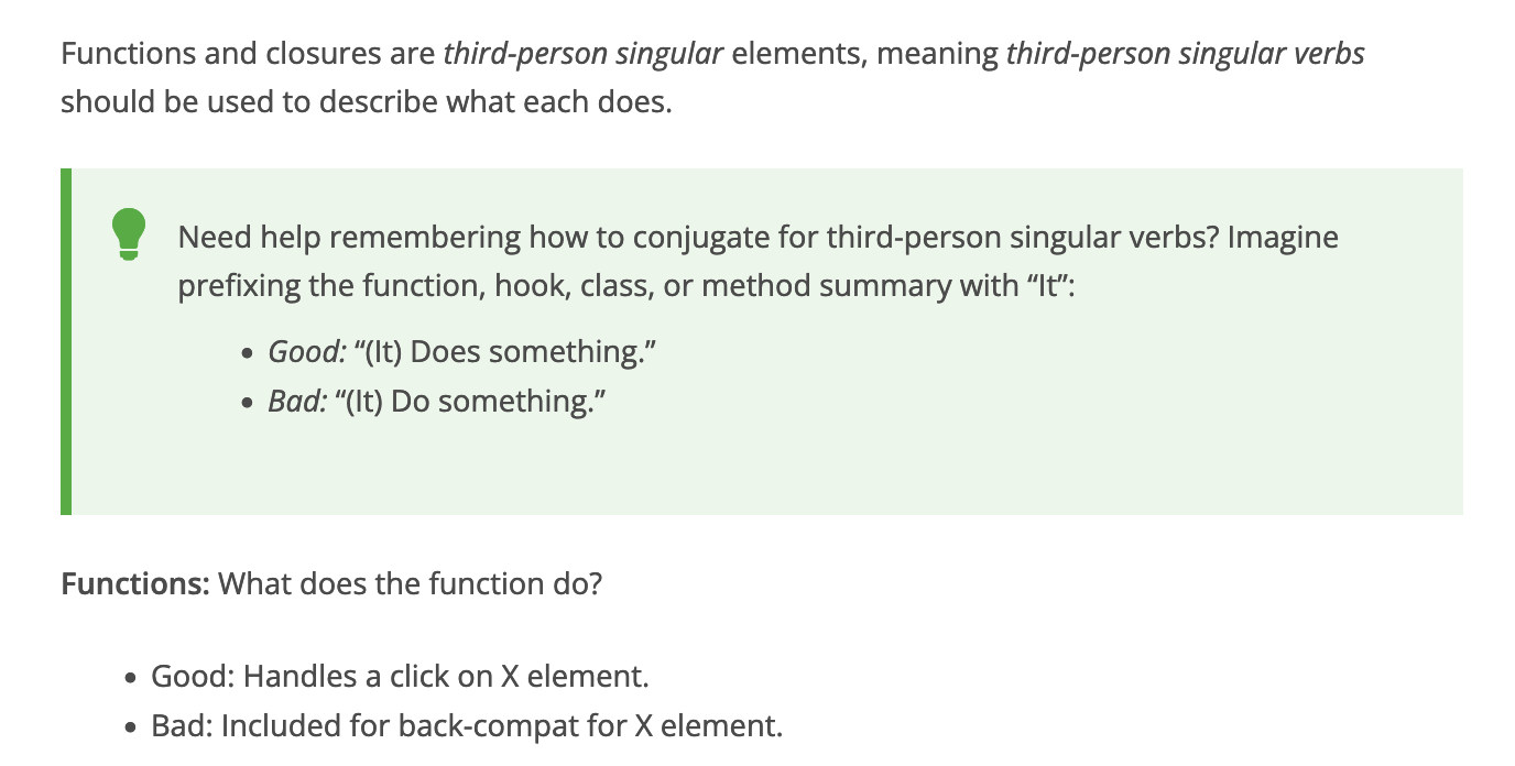 [tip]should be double-checked as I'm not sure if the shortcode doesn't break now the contents is reformatted.**not##..) in the "Formatting Guidelines" section, about which I wonder if those shouldn't be changed to proper headers.See: https://developer.wordpress.org/coding-standards/inline-documentation-standards/javascript/#formatting-guidelines