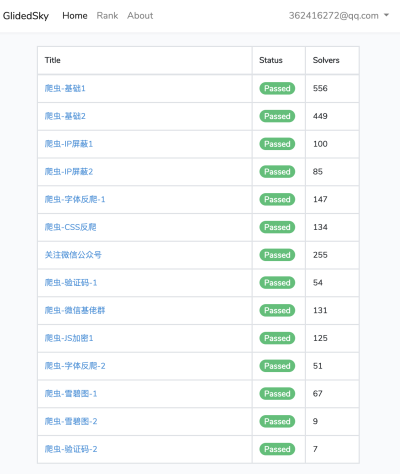 一个很不错的爬虫练习题网,内涵十几个爬虫题目,由浅到深涵盖 ip反爬、js反爬、字体反爬、验证码 等题目。安利给大家,博主已撸完。