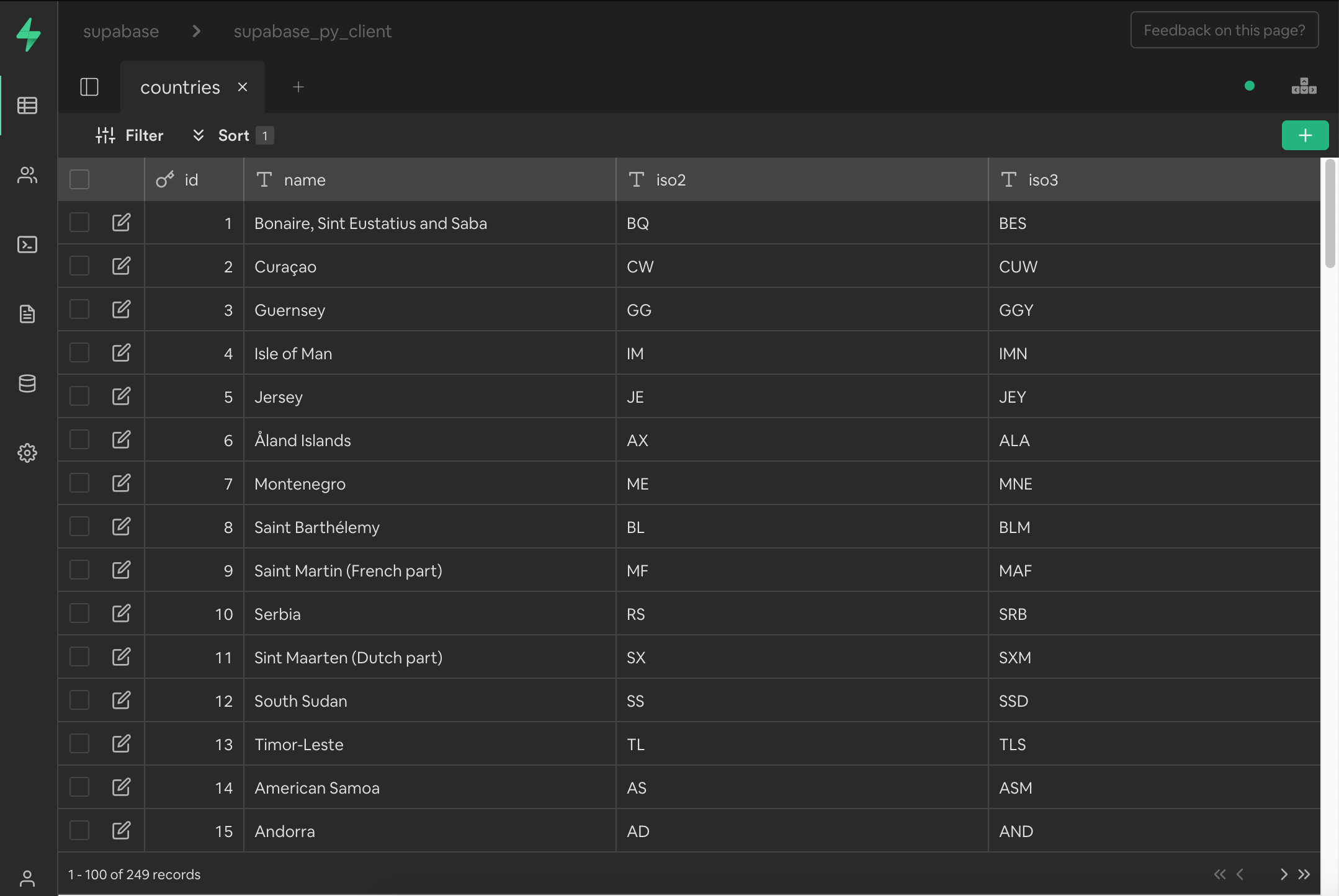 data = supabase.table("countries").delete().eq("id", 1).execute()from supabase import create_client, Client