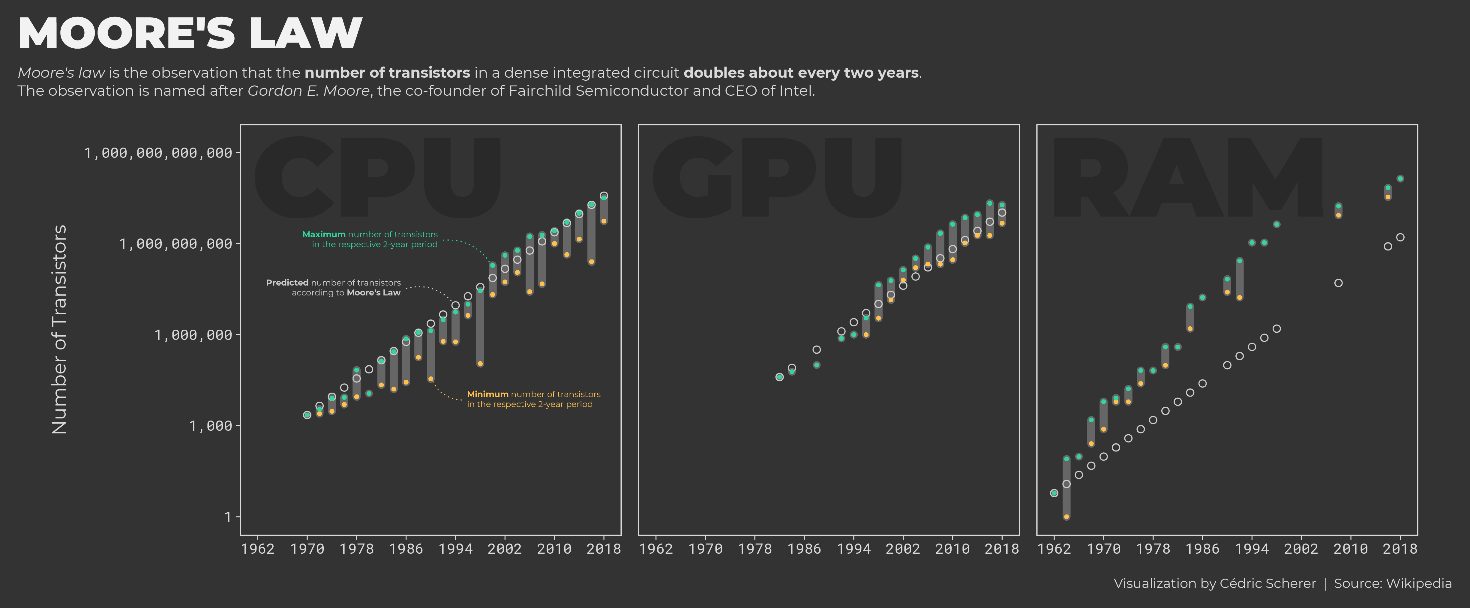 Week 2019/36 🖥️ Moore's Law by Wikipedia Predictions based on exponential growth: Predictions based on previous 2-year period:
