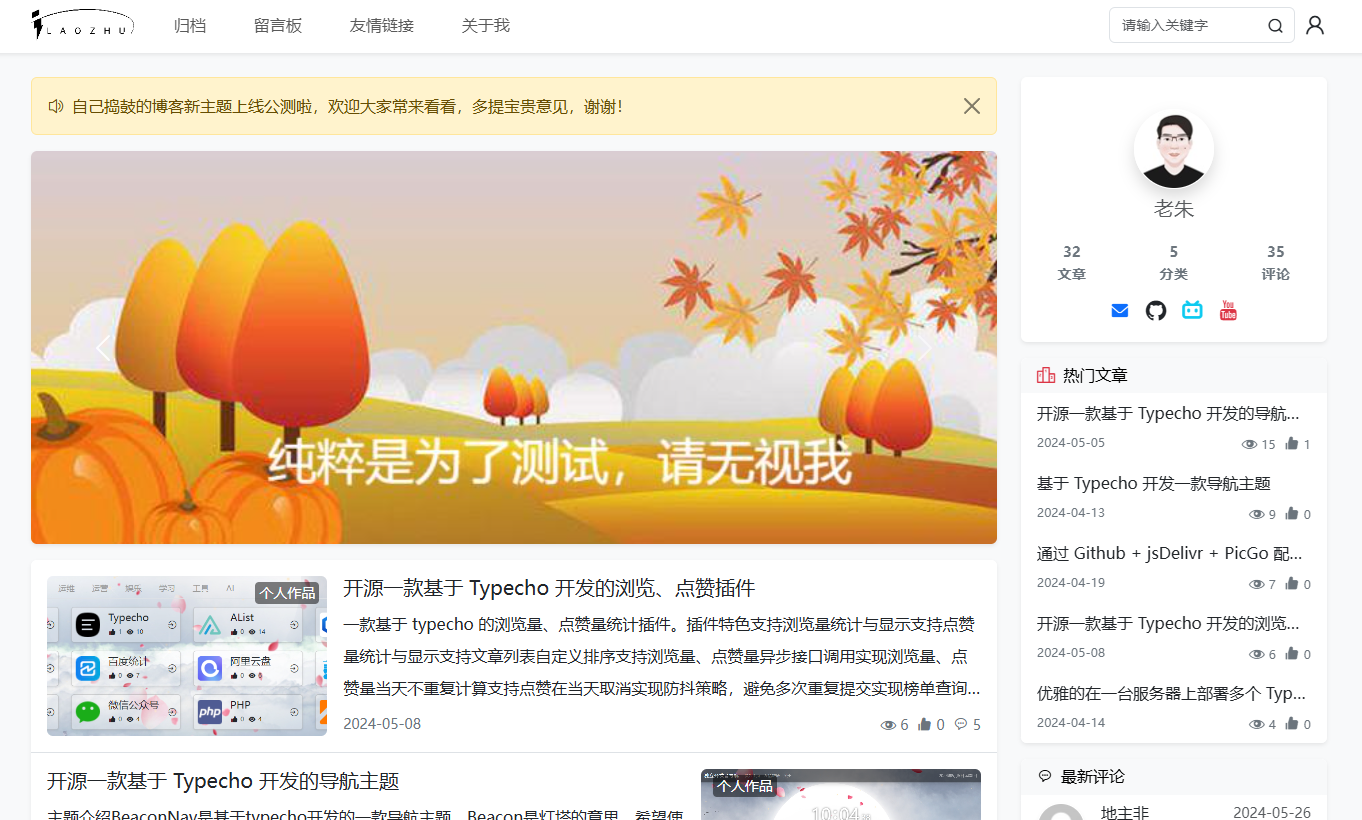 - 支持公告、轮播图、热门文章、最新评论、分类、标签云等可选组件;