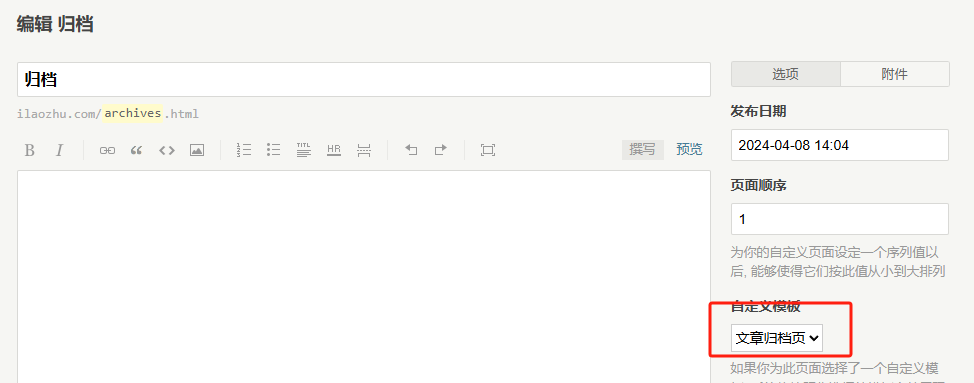 主题中实现了一个文章归档页面模板,可在添加文章归档独立页面时,在自定义模板中选择文章归档页面模板,文本区不需要填写,空着即可。