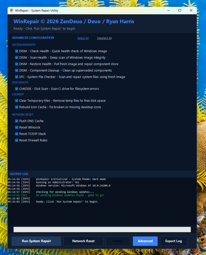 The only reason I began this was because the other day my friend had suffered Internet issues which had just required a Windows Network Reset and it fixed his internet speeds immediately and then today (Monday 16th February) my other friend was suffering from some broken Windows System Files and had to manually get each DISM command and the SFC command from the web and he said he wished there were a simple GUI for it so I was just going to slop something together but I really got into it after I saw how successful AI was at building the application and making it work and I was so happy that I had to finish it to the end and now I'm really happy with it and I hope it helps anyone with corrupt Windows System files!