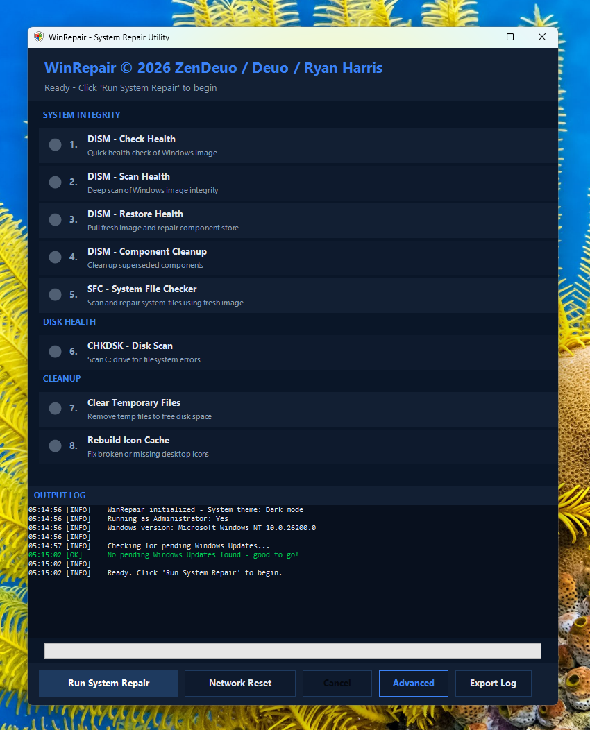 - One-Click Repair: Automates the standard Windows repair sequence (DISM → SFC → CHKDSK).
