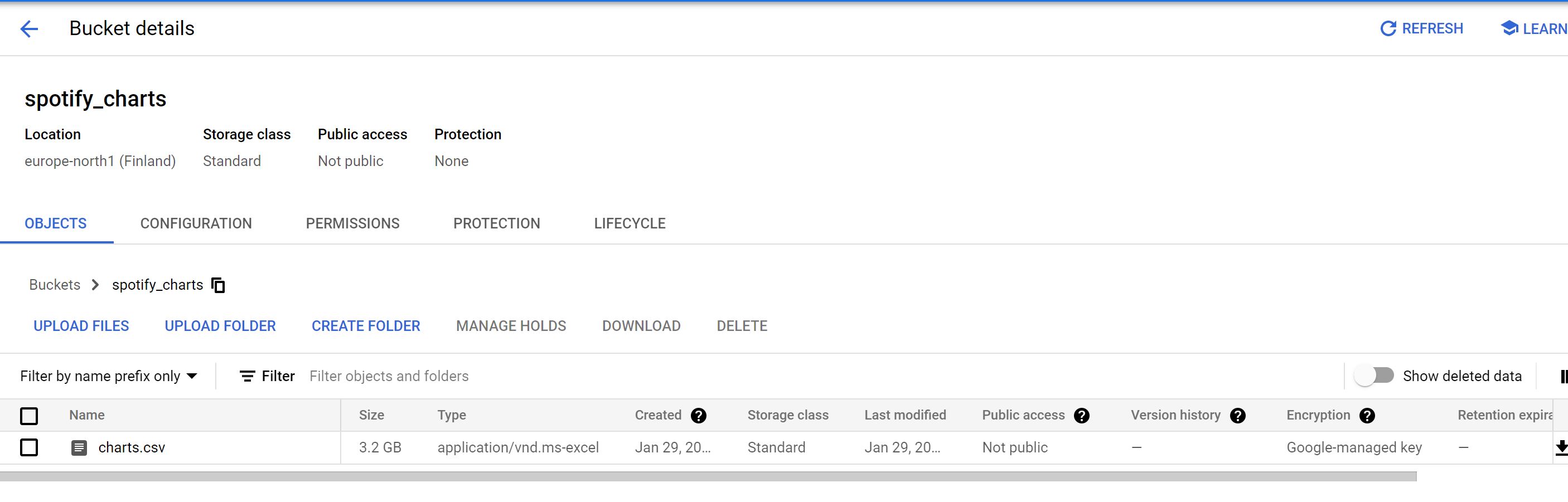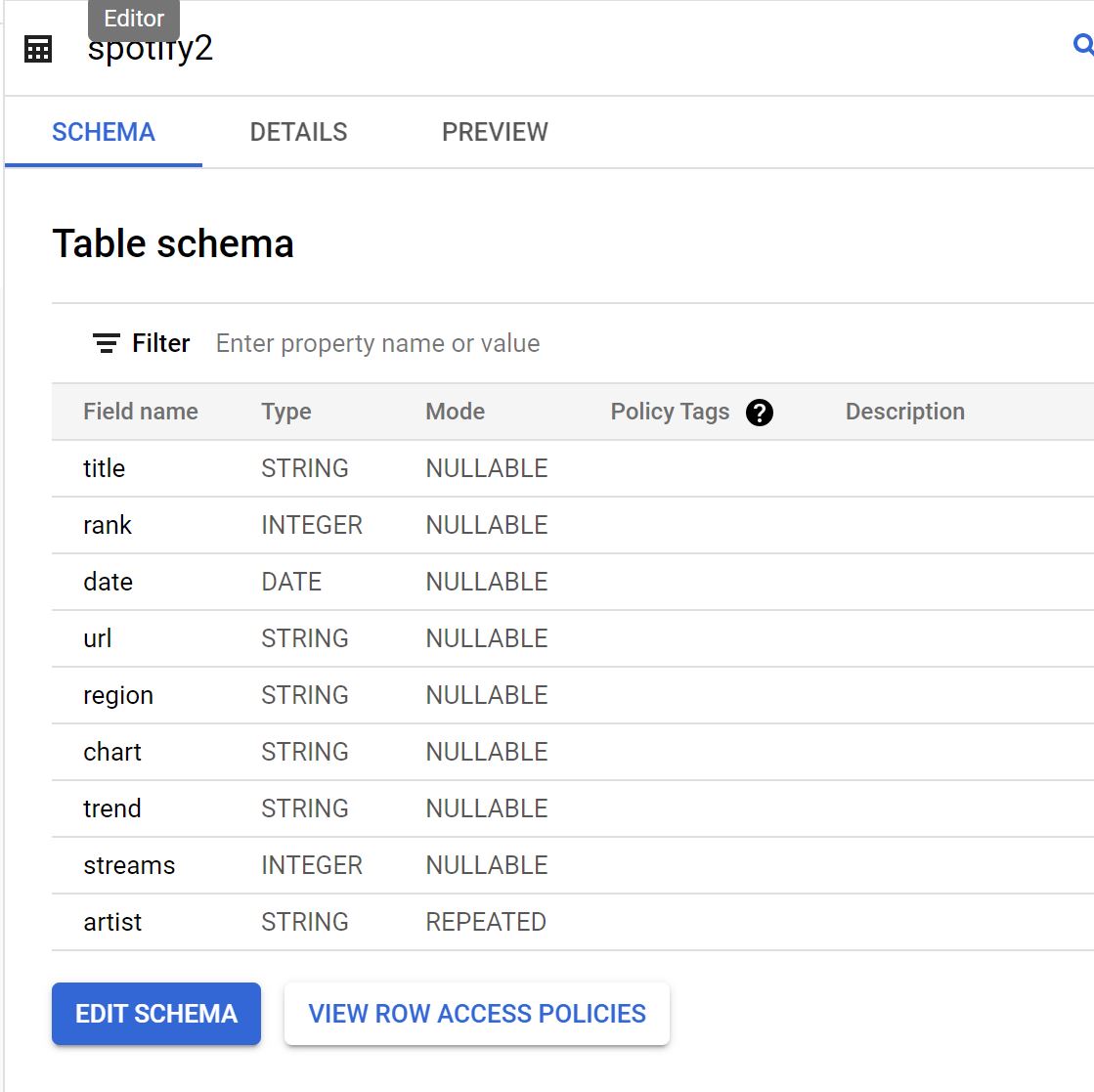 In this project I analyze data from Spotify, datasets is a big csv file a 3.4G csv file, download from kaggle API: "datasets download -d dhruvildave/spotify-charts", I analyze the data in Google Cloud BigQuery using SQL. I load data from Google Cloud Storage to BigQuery. BigQuery is a Data Warehouse on Google Cloud Platform, which is powerful to handle big data and do data analysis.