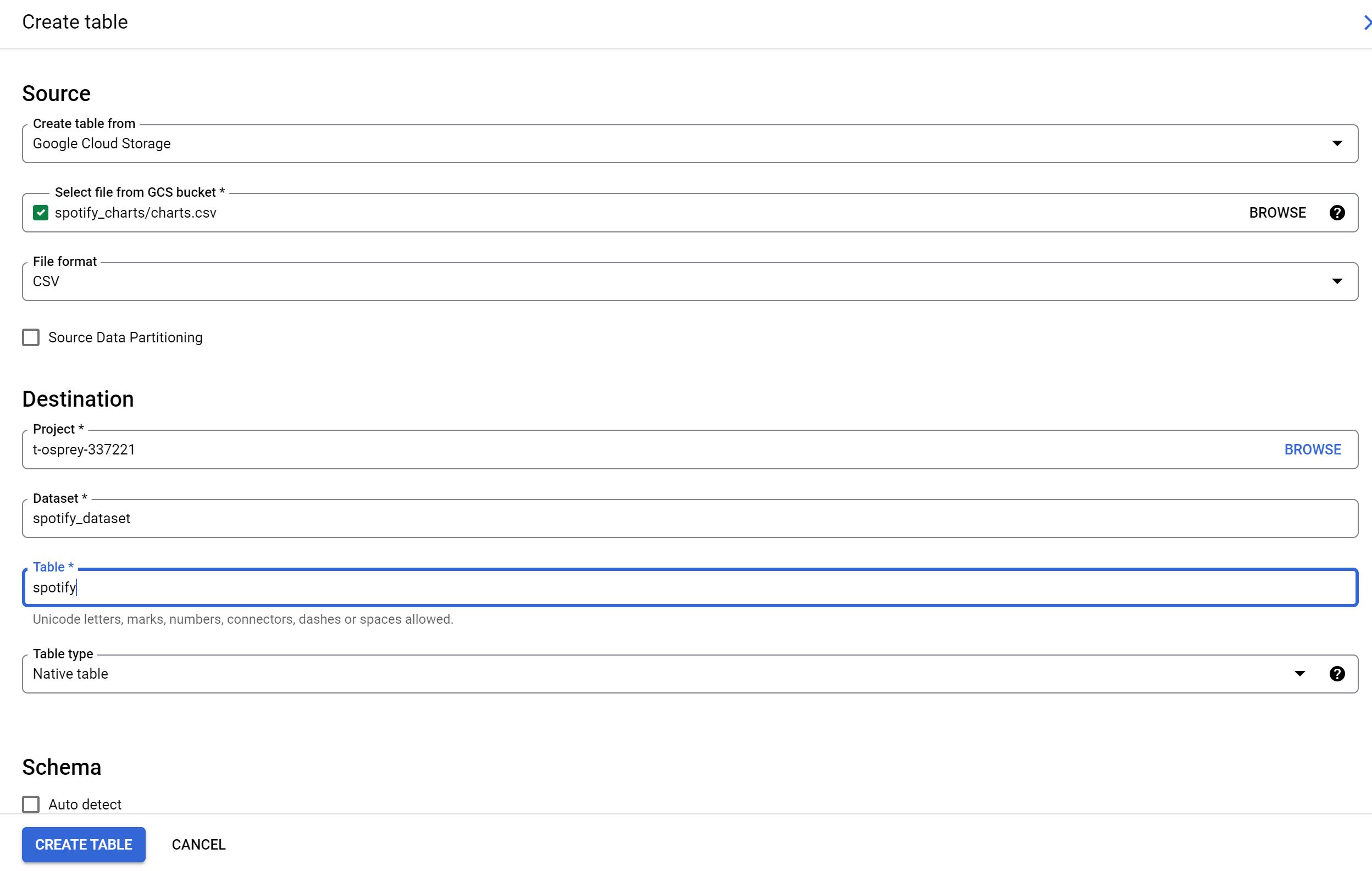 Create a dataset in Bigquery, and create a table directly from google cloud storage