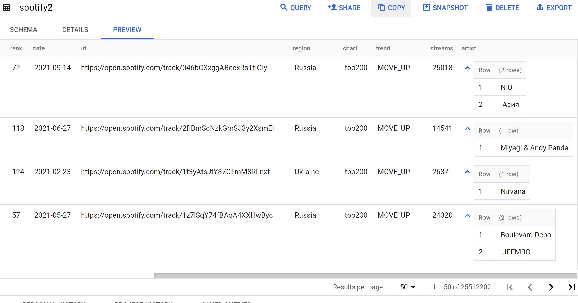 You will see artist mode change to repeated, that is an array, we save the result to table spotify2