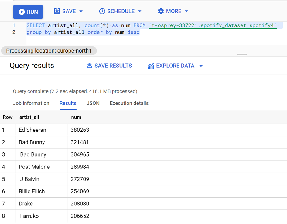 SELECT artist_all, count(*) as num FROM `t-osprey-337221.spotify_dataset.spotify4`
