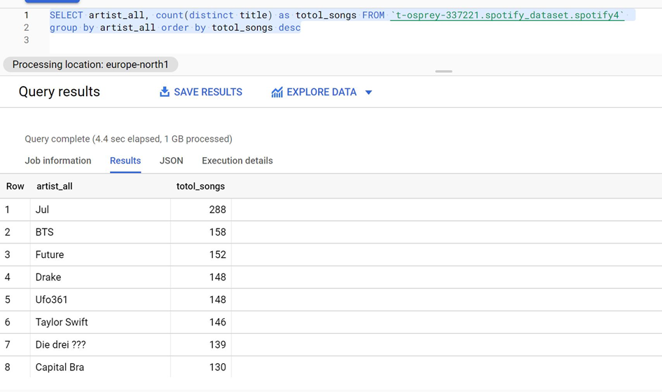 SELECT artist_all, count(distinct title) as totol_songs FROM `t-osprey-337221.spotify_dataset.spotify4`