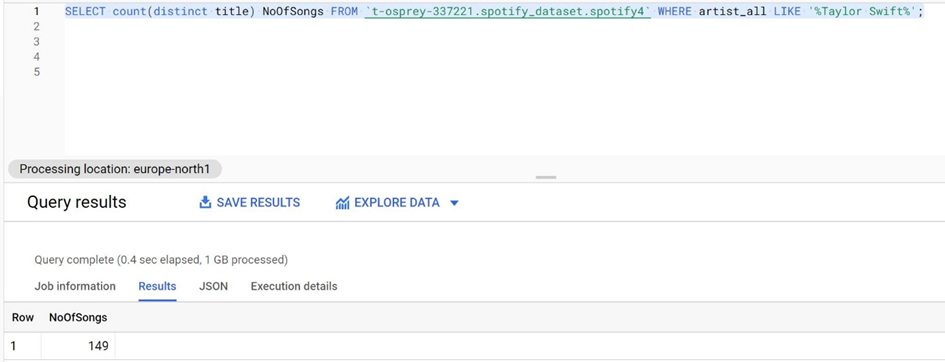 SELECT count(distinct title) NoOfSongs FROM `t-osprey-337221.spotify_dataset.spotify4` WHERE artist_all LIKE '%Taylor Swift%';