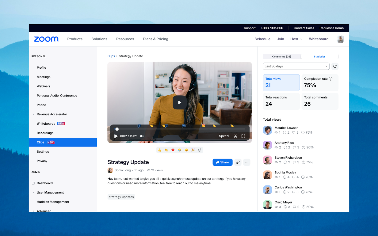 - Viewer Analytics – See who watched, for how long, and where they dropped off inside Zoom Clips.