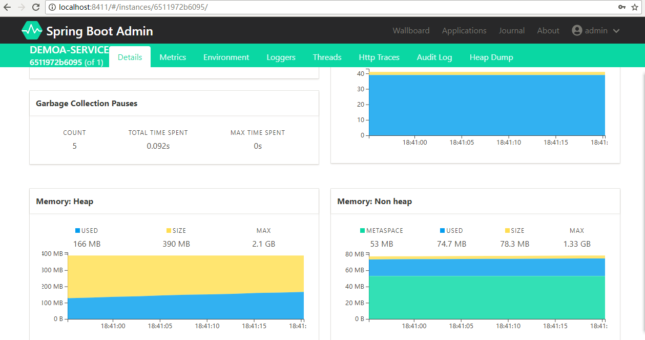 2.2 登录后,在控台中将看到上面启动的两个微服务各维度的监控情况