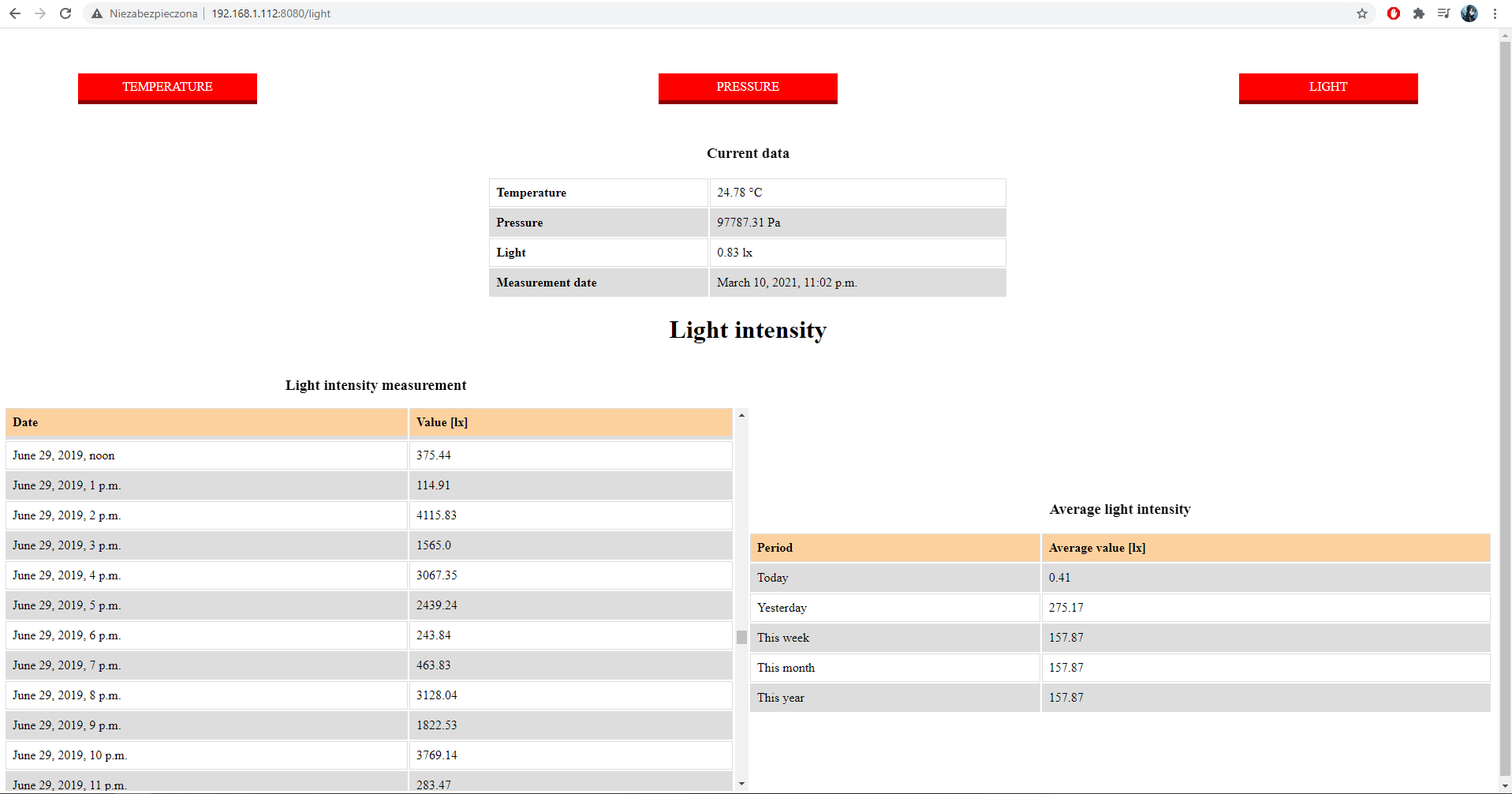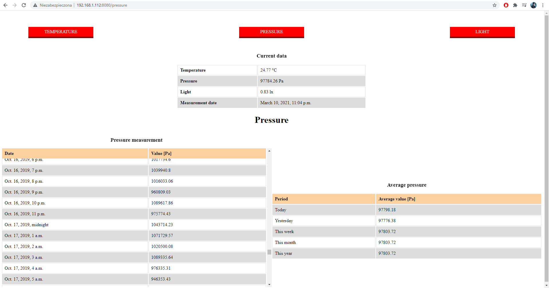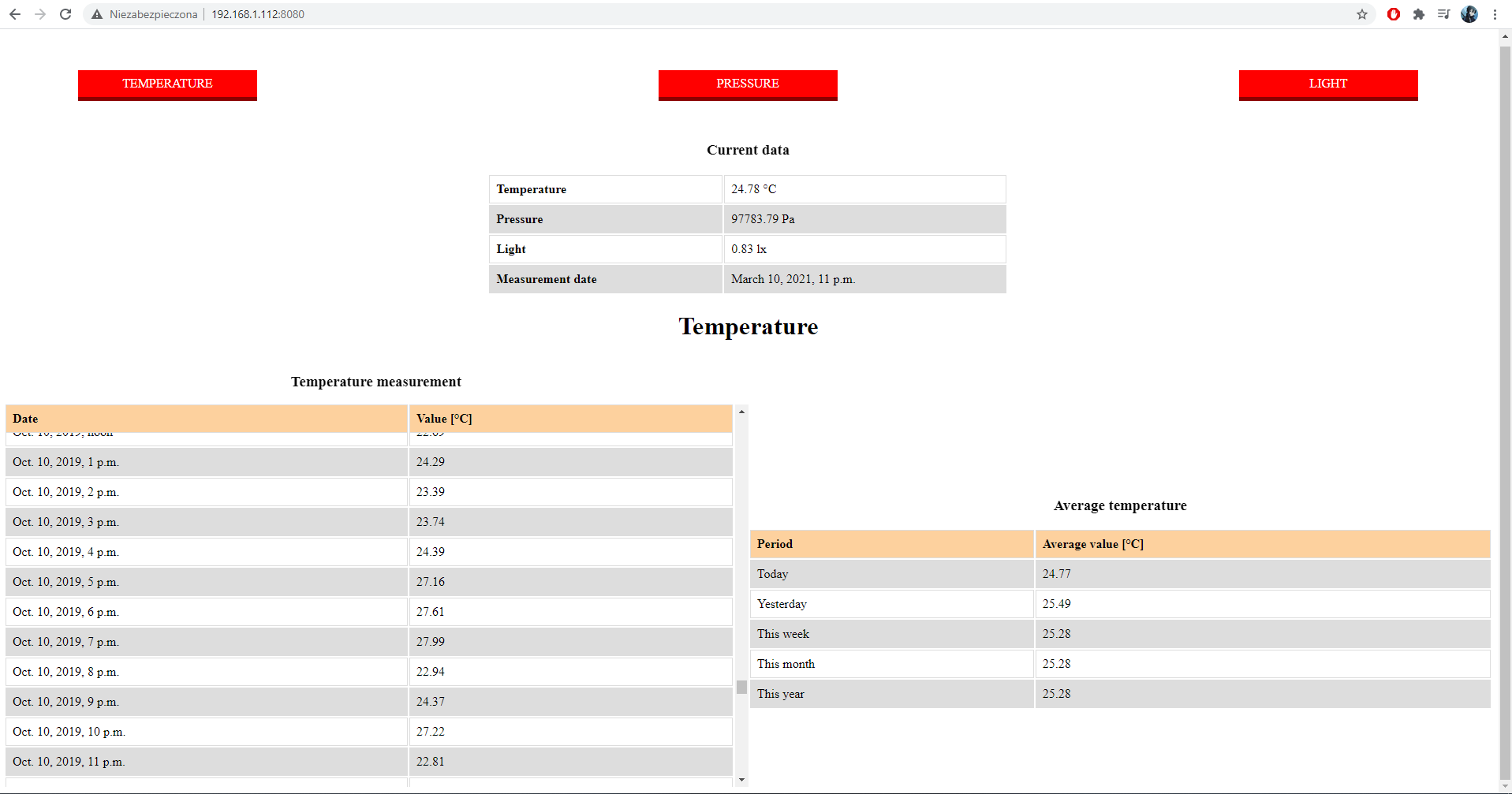 Each page has three tables. First table shows current measurement. If you refresh website, Django will execute measurement and show current fresh data. Second table shows all measurements with date. Last table shows avarage values for given periods of time.