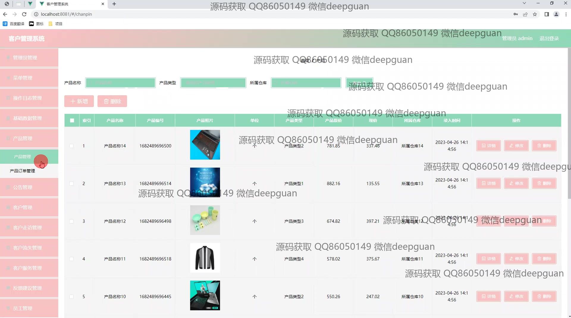 基本功能包括系统的登录和注册,用户管理模块提供对客户信息的增删查改(CRUD)权限,支持客户信息导入导出。管理平台的公告、产品及客户订单可通过相应的管理页面进行编辑、删除及查看,还包含对客户反馈与服务的管理功能模块。系统日志记录和管理权限分配用于操作追溯和安全管理,管理员还可以查看和设置系统公告、产品列表及进行系统功能模块的配置。