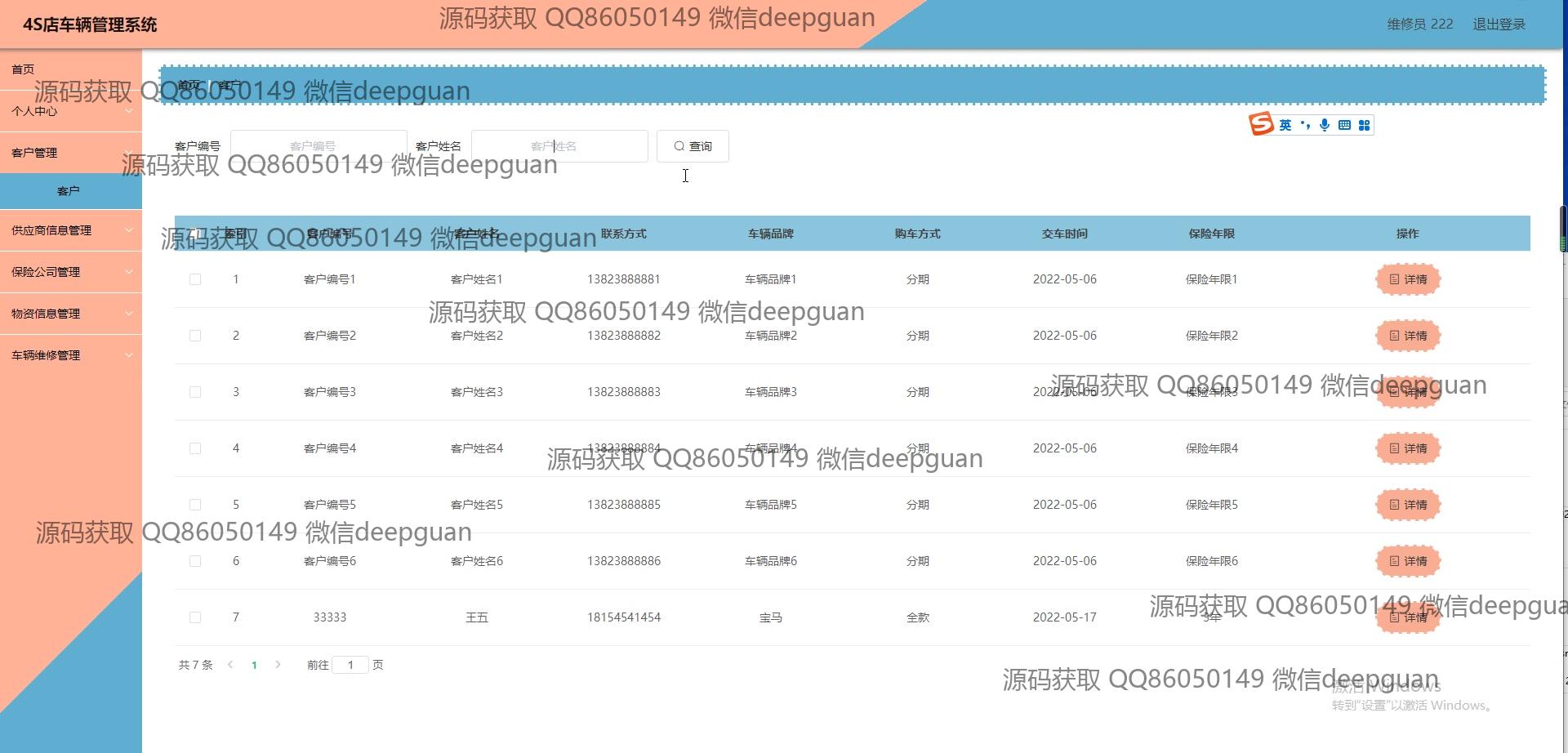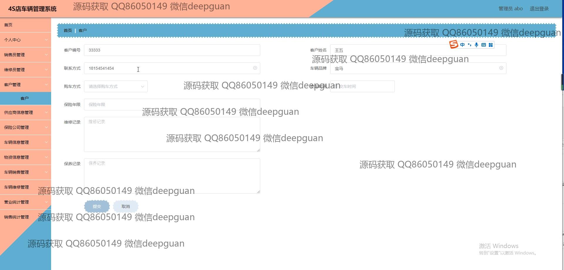 客户:客户信息模块允许管理员输入及维护客户的个人信息、联系信息及相关的车辆和保险信息。该模块提供客户信息的快速查询与检索功能,并记录与其相关的车辆购买和维修历史。客户可以通过联系管理选项与系统互动,确保为其提供支持和后续服务的快捷性和有效性。