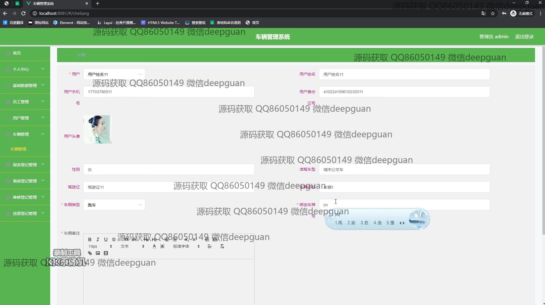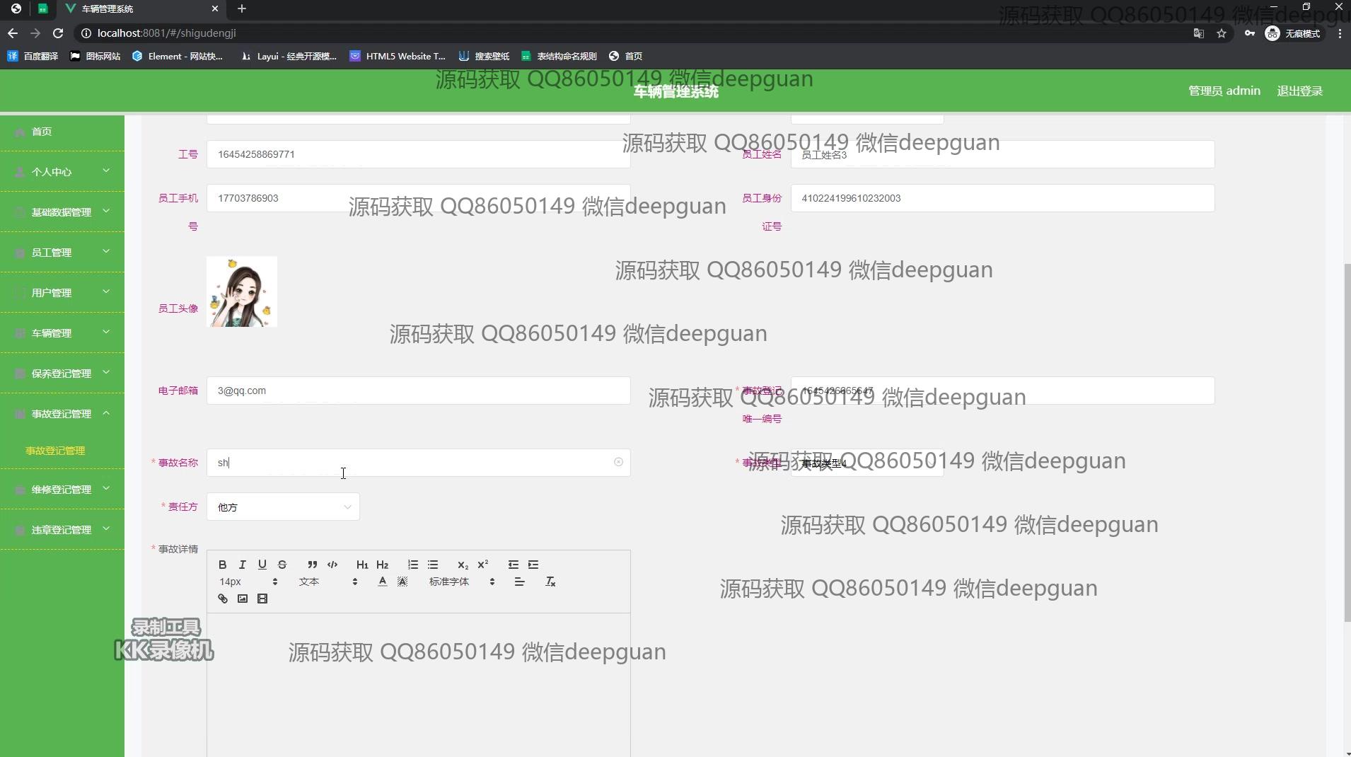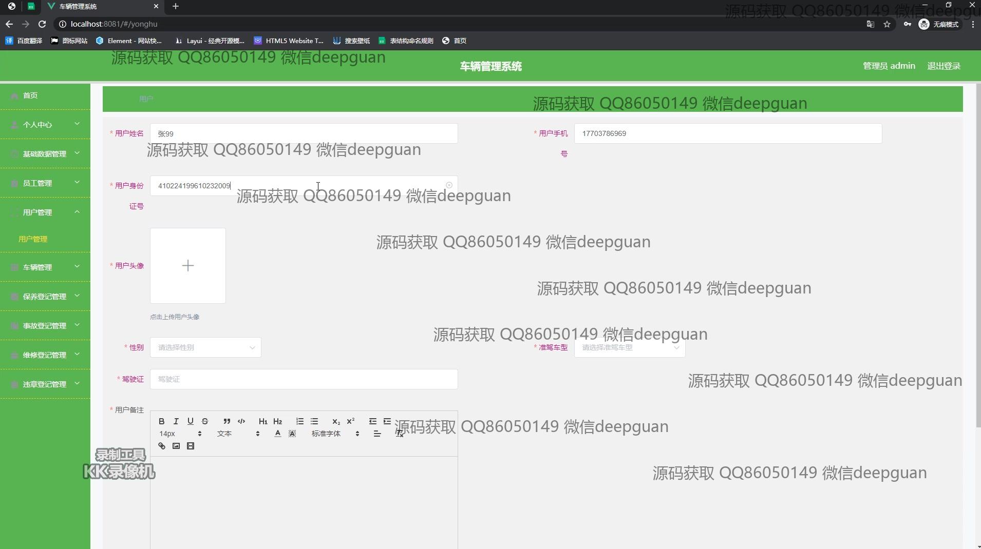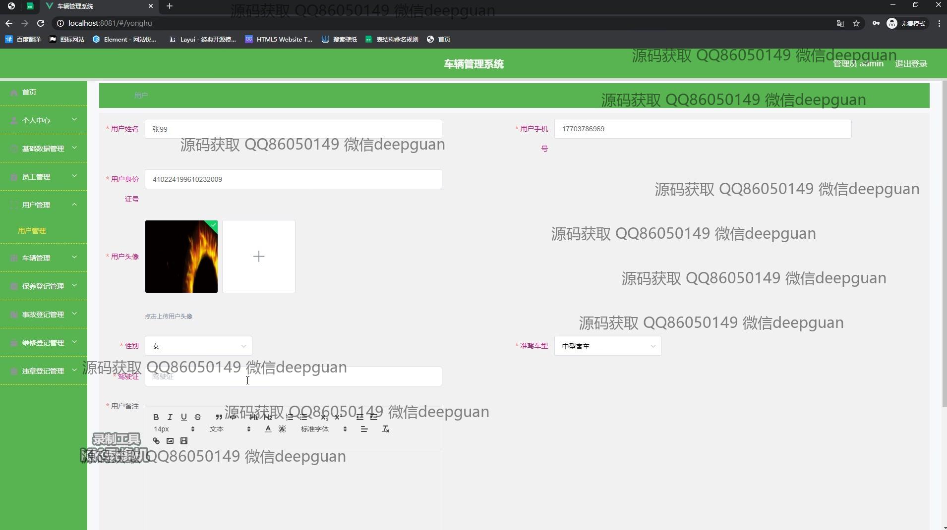 用户:登录后通过侧边栏进入个人中心界面,在用户信息页可查看和编辑个人身份证号、手机号、电子邮箱等信息,还提供头像上传功能。在车辆管理模块,用户可按车辆名称、车牌号查询车辆信息,并进行添加和编辑操作。个人中心模块支持用户姓名、身份证号、性别等信息的编辑,同时可以查看驾驶证与准驾车型信息。在事故登记和管理页面,用户能查看事故编号、名称及详细描述,并使用日期选择器记录事故时间。