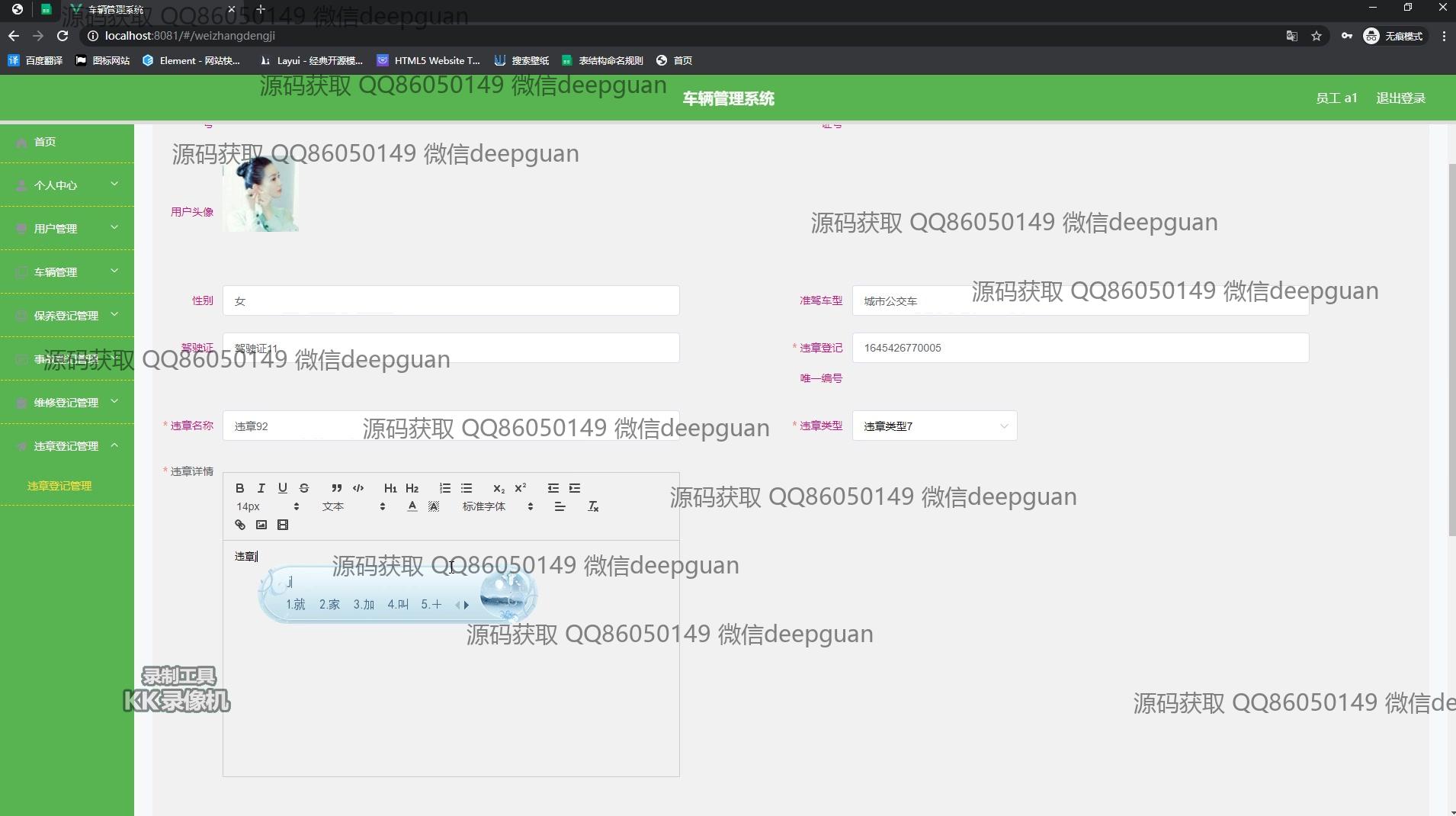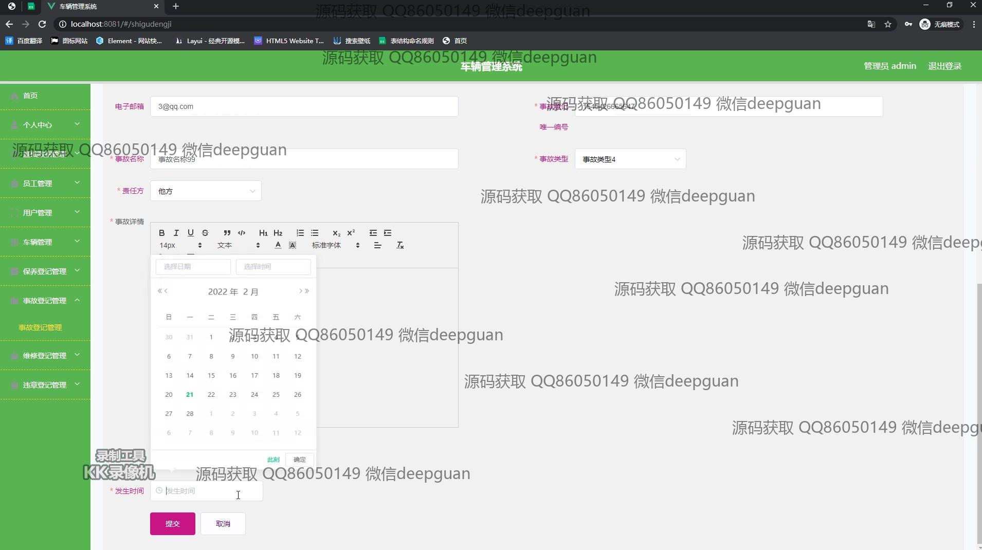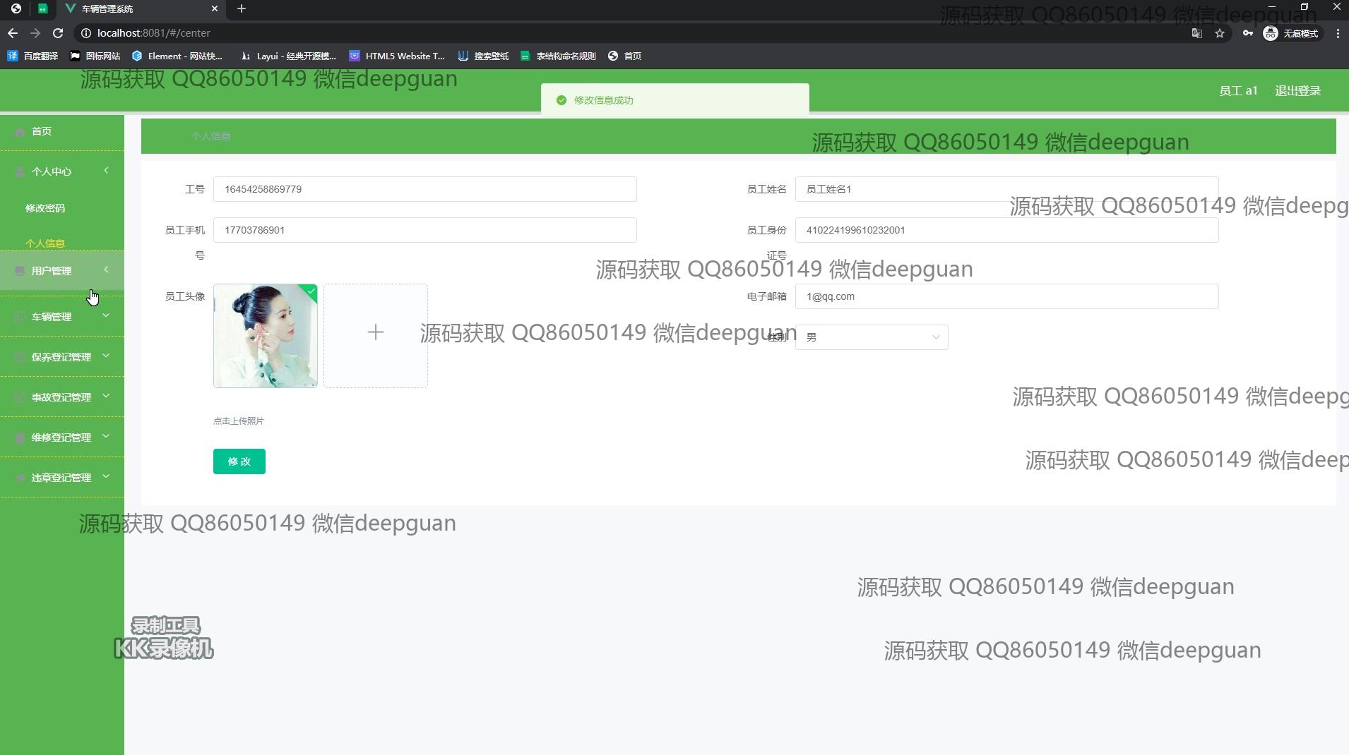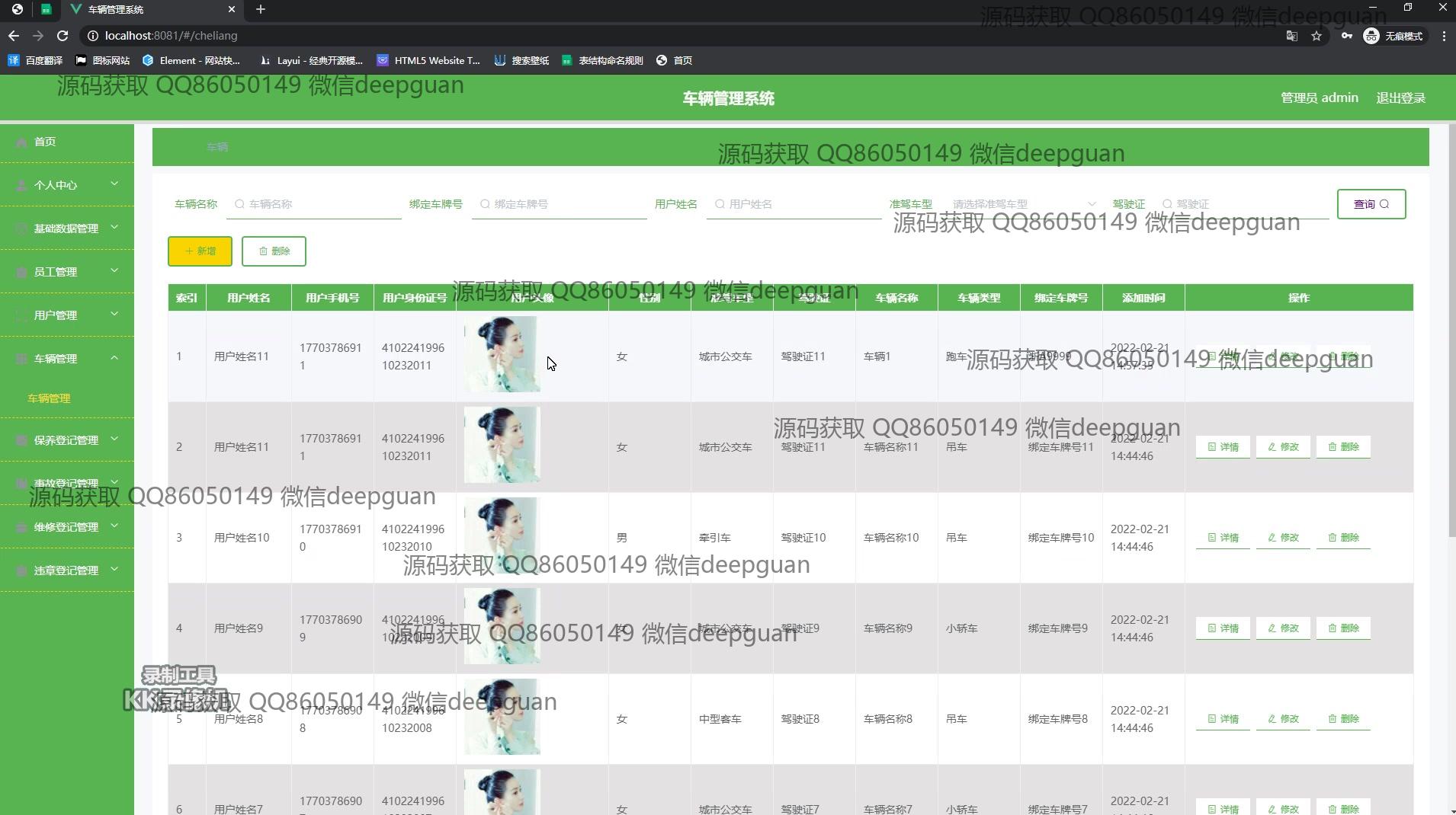 用户:登录后通过侧边栏进入个人中心界面,在用户信息页可查看和编辑个人身份证号、手机号、电子邮箱等信息,还提供头像上传功能。在车辆管理模块,用户可按车辆名称、车牌号查询车辆信息,并进行添加和编辑操作。个人中心模块支持用户姓名、身份证号、性别等信息的编辑,同时可以查看驾驶证与准驾车型信息。在事故登记和管理页面,用户能查看事故编号、名称及详细描述,并使用日期选择器记录事故时间。