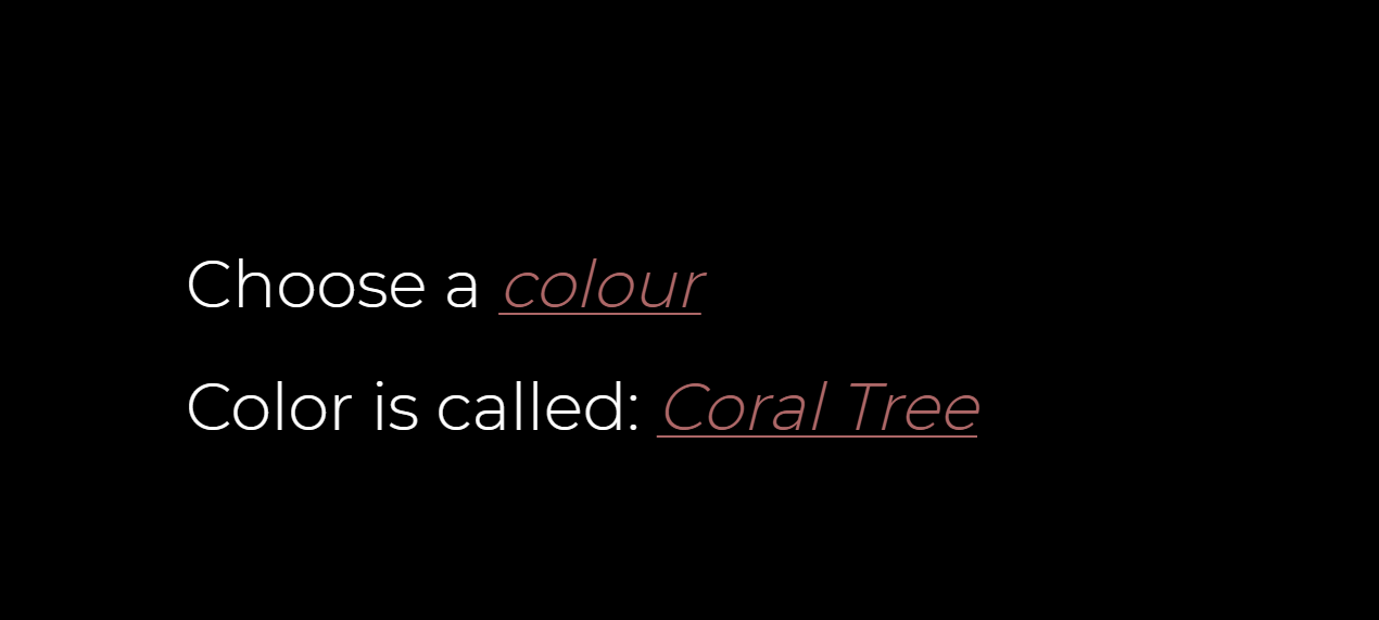 whats-that-color Click on color Choose a color The name appears at the bottom Small project to learn about: Events color input styling elements Edit on StackBlitz ⚡️