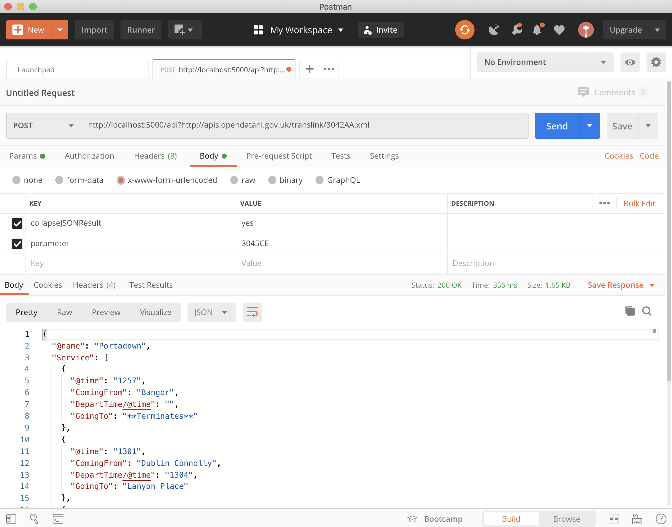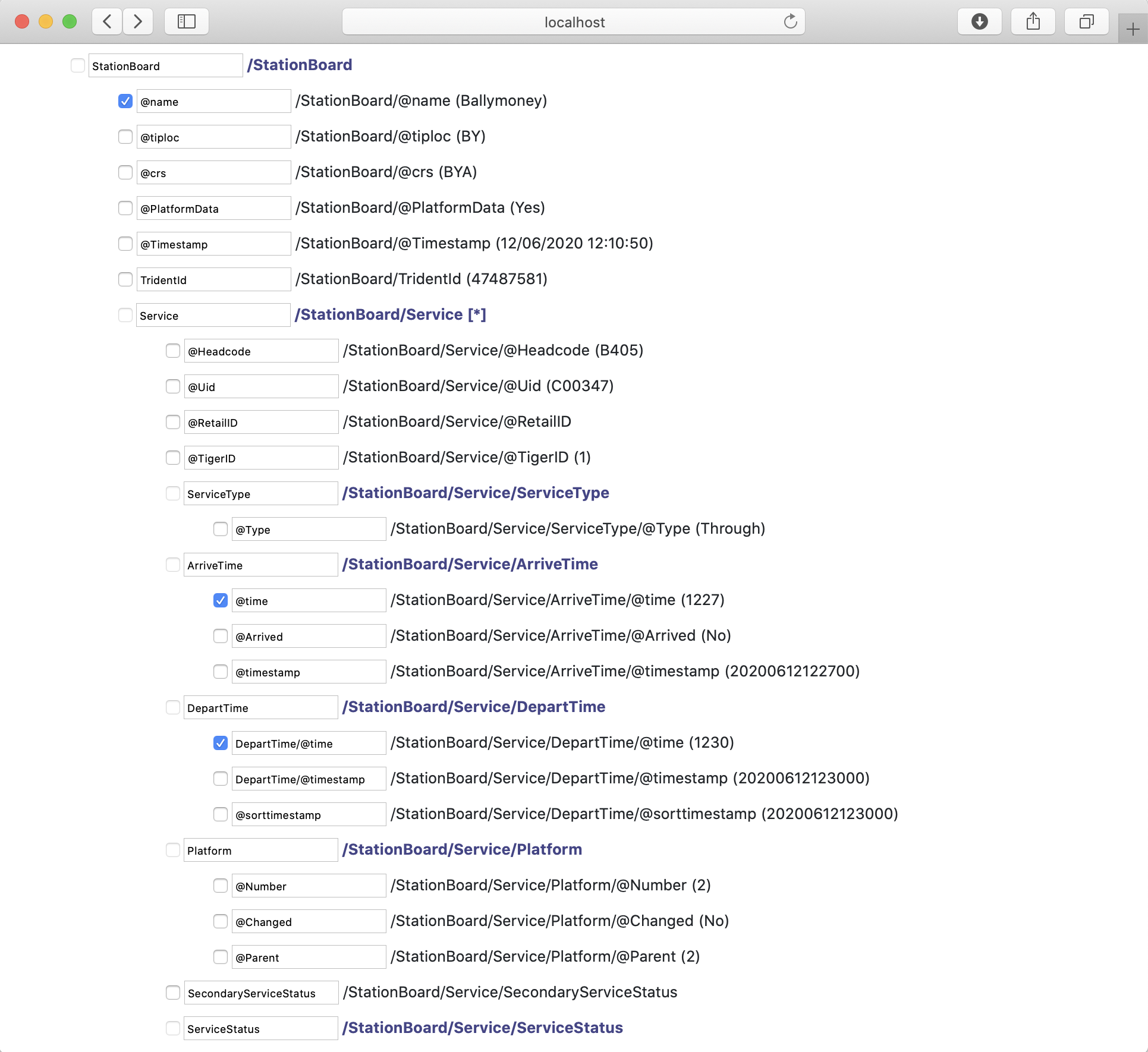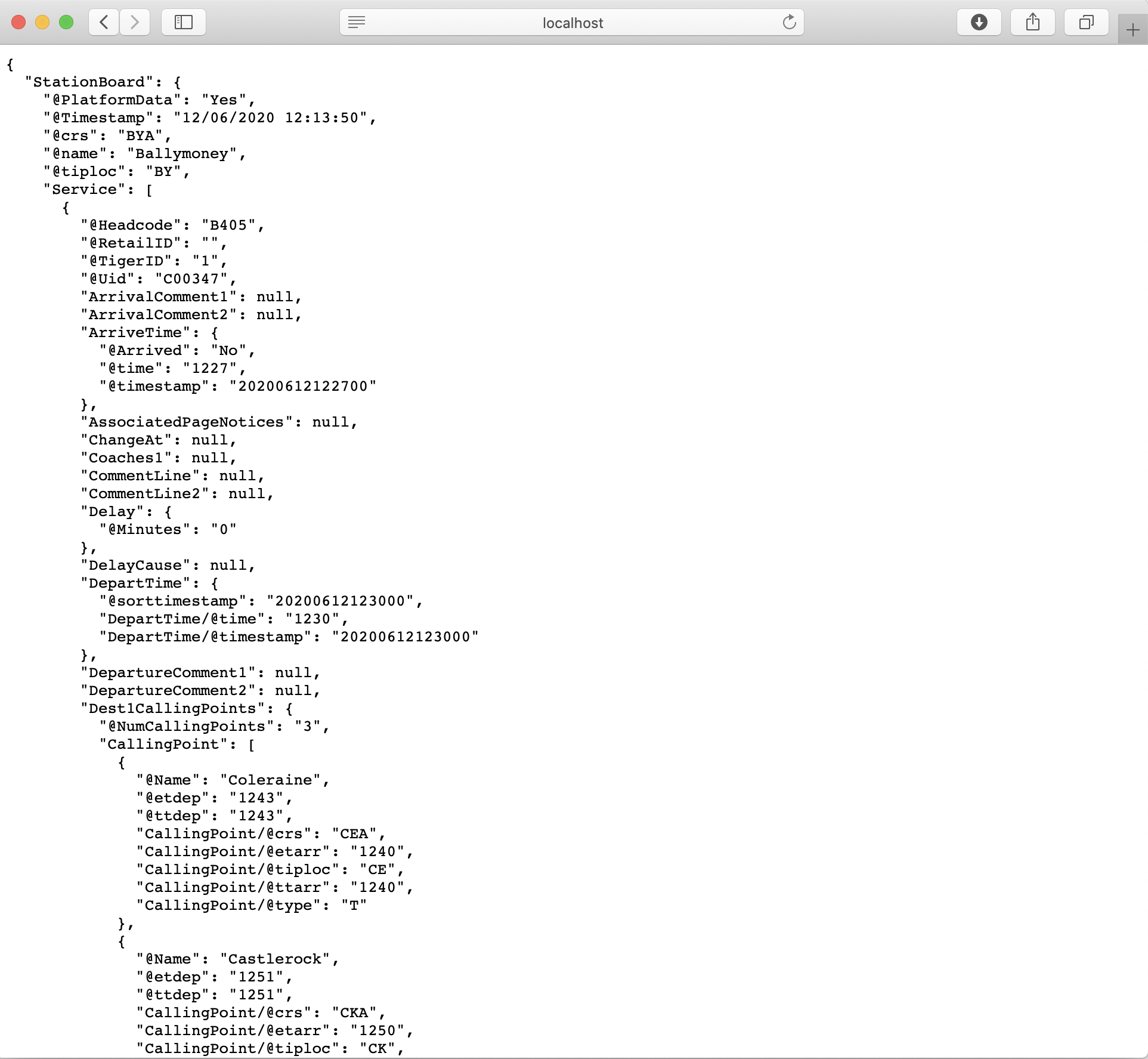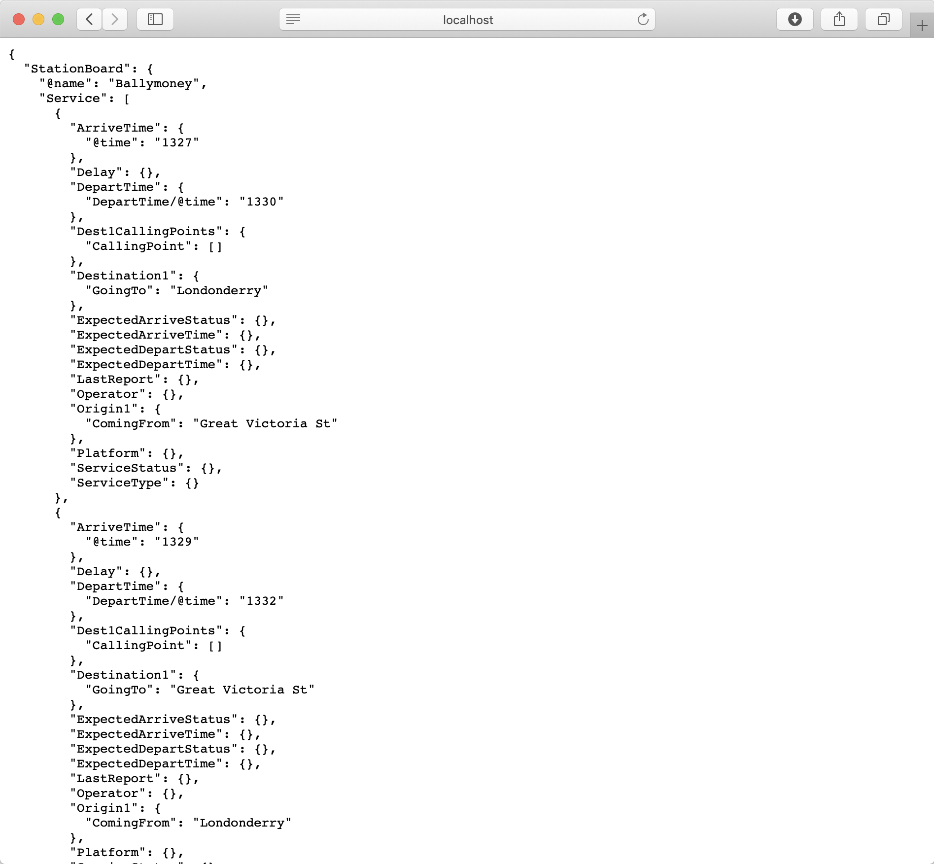 Run the Python application and access it in a web browser, passing the URL of the XML source as the querystring. For example, with a local installation running on port 5000, we request the XML data shown below by the URL http://localhost:5000/?http://apis.opendata.gov.uk/translink/3042AA.xml.