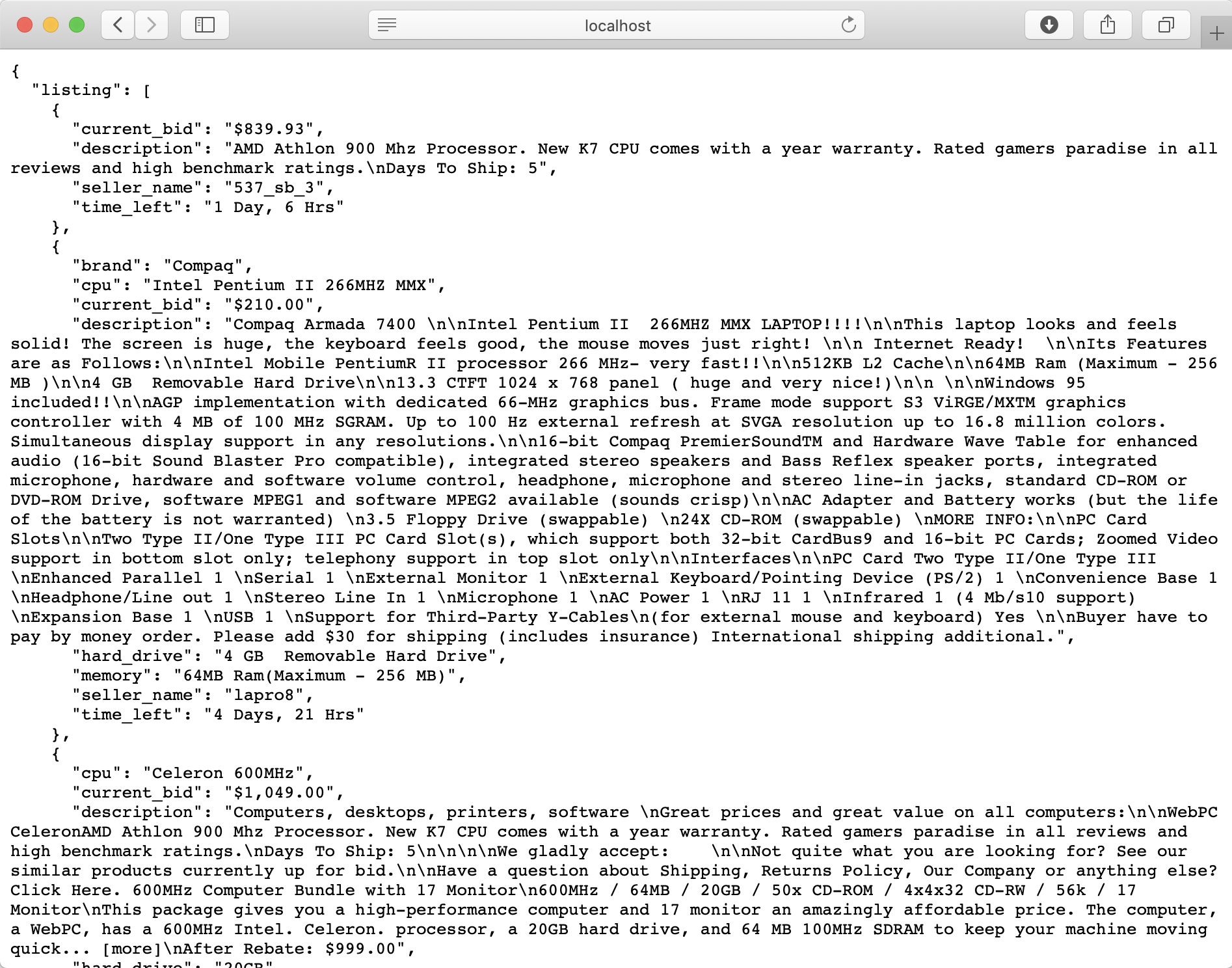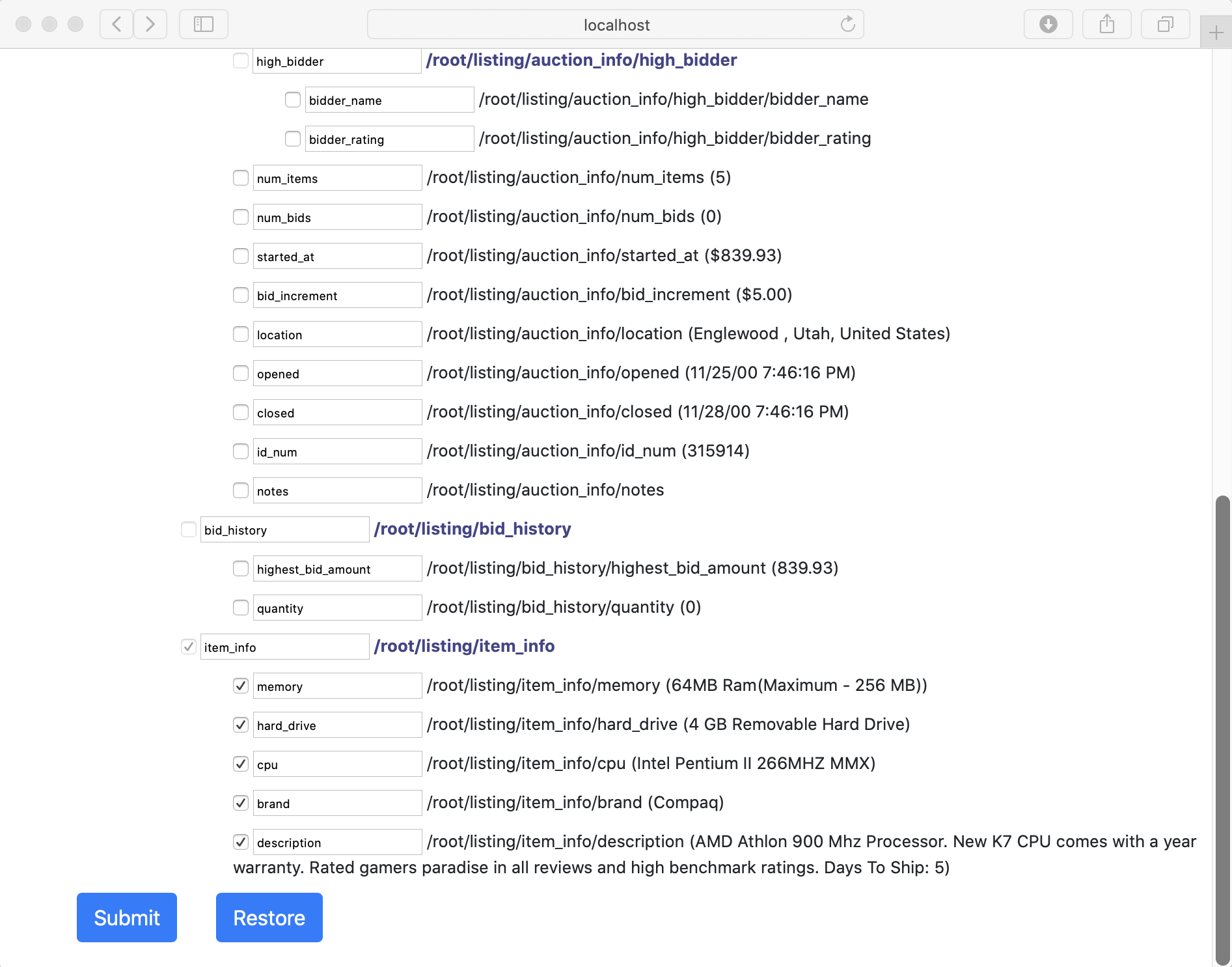 auto{API} can also remove null values from the resulting JSON data. Here, we specify that we want to retrieve auction data from the resource at http://aiweb.cs.washington.edu/research/projects/xmltk/xmldata/data/auctions/321gone.xml and specify the fields that we are interested in.