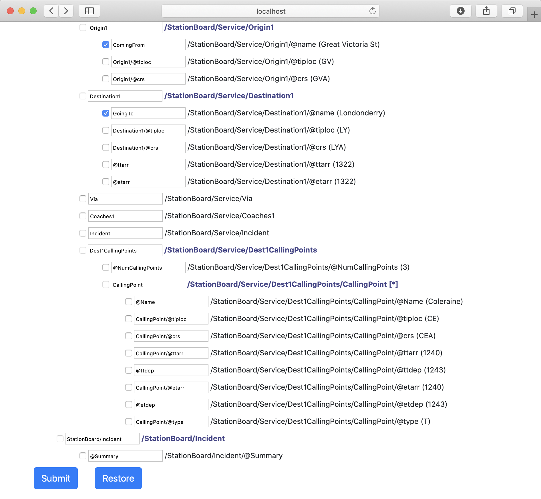 ... and the origin station and final destination for each service. We also choose to rename these fields as "ComingFrom" and "GoingTo" to provide more intuitive field names. Now click on the "Submit" button to store these selections in the database.