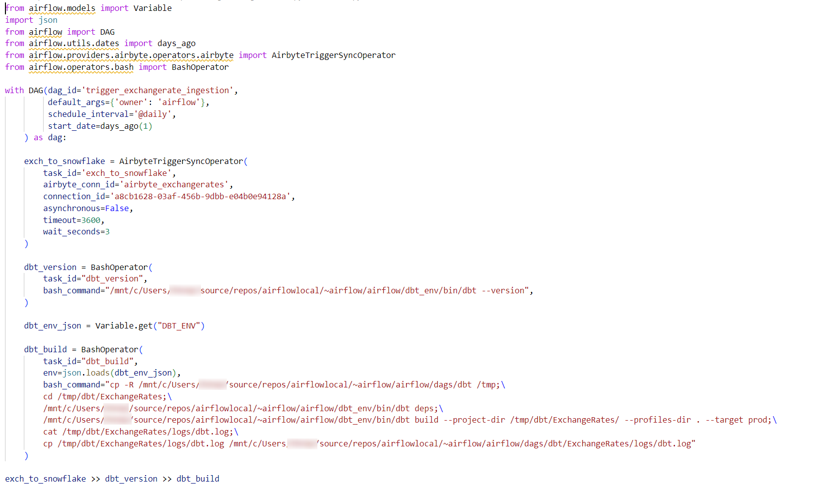 Fill in blanks in code as indicated in the file. See example below for guidance. Add dag_exchangerates.py to your Airflow DAG folder.