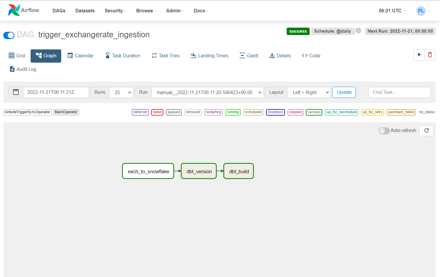 The Airflow DAG allows you to orchestrate the ingestion via AIrflow including querying via API & loading data to Snowflake (via connection to Airbyte) and execute the ExchangeRates DBT Project on the Snowflake data to promote data to Silver & Gold.