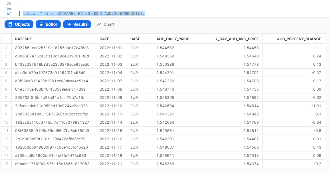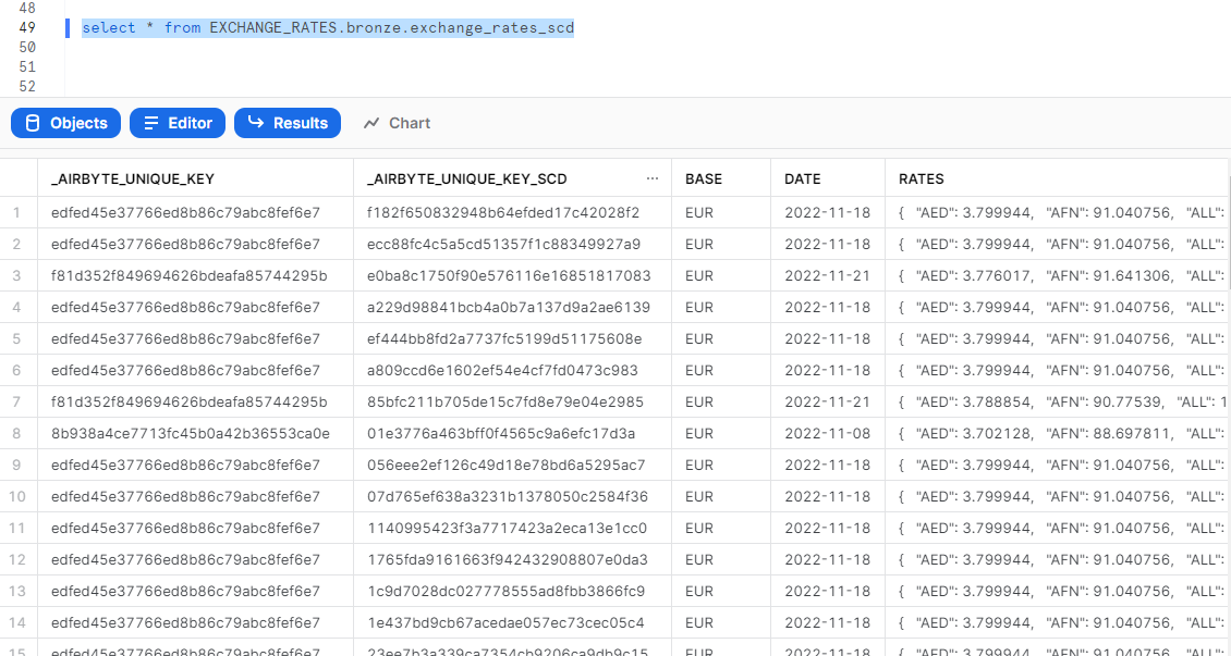Exchange Rates API connector is available in Airbyte. The data is extracted using credentials and loaded into the Bronze layer of Snowflake. There are 3 raw tables conatining similar data. These are: