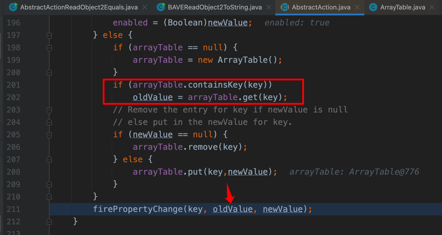这里的利用链看起来挺短的,但是构造起来还是挺复杂的 主要看AbstractAction#putValue方法,这里需要让arrayTable里包含key,才能给oldValue赋值,但在序列化的时候,action.putValue两个一样的key肯定是不行的,因为在序列化时遇到相同的key无法取到
