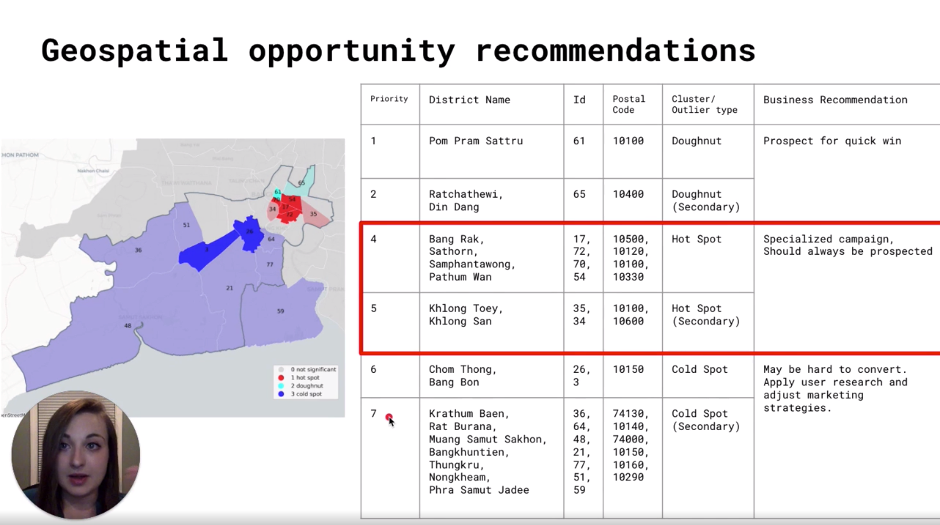 Local Moran's I (I=0.241, p=0.0048) of 83 Bangkok districts' venue value per capita identified one hot spot (4 districts), one cold spot (2 districts) and one geospatial outlier for targeted prospecting and market research. Sensitivity analysis produces an area of interest of districts which self-cluster into the entire southwest region (17 districts). Recommendations to a hypothetical business were made, starting with immediate prospecting in 'doughnut' outliers, which have potential to provide high value like their neighbors.
