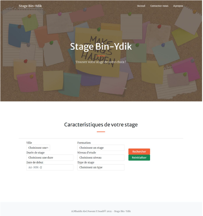 The present project, realization of a web application of internship management, is carried out within the framework of the preparation of the mini project of the end of our module j2ee, it is about a web application named " Stage Bin-Ydik " which is developed in the JEE environment using several tools.