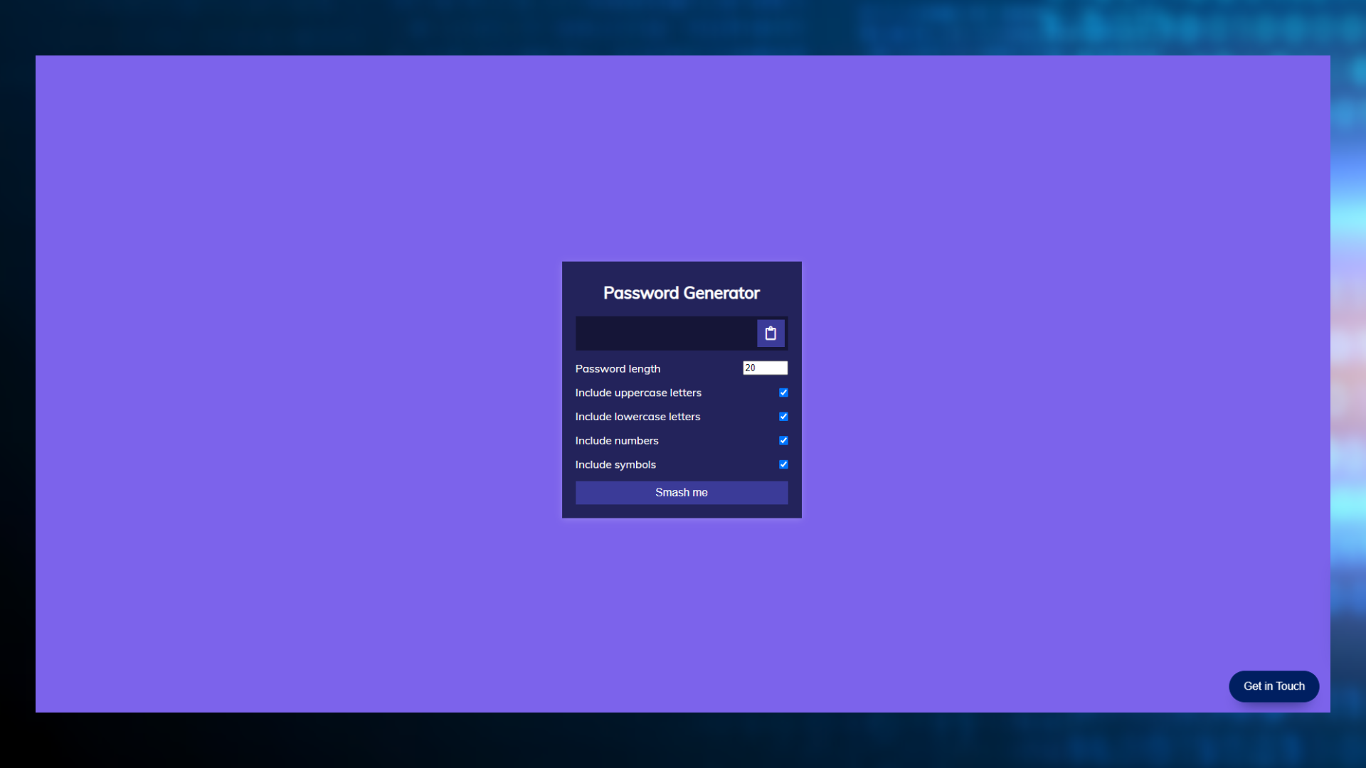 Password-Generator π Random Password Generator using HTML, CSS, JavaScript comes with 5 options in order to generate a unique password every single time. Desktop View π₯οΈ Mobile View π± Goal π― : To understand the concepts of JavaScript.